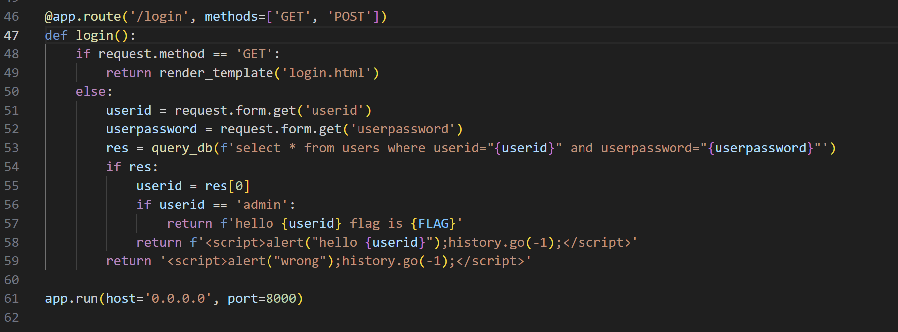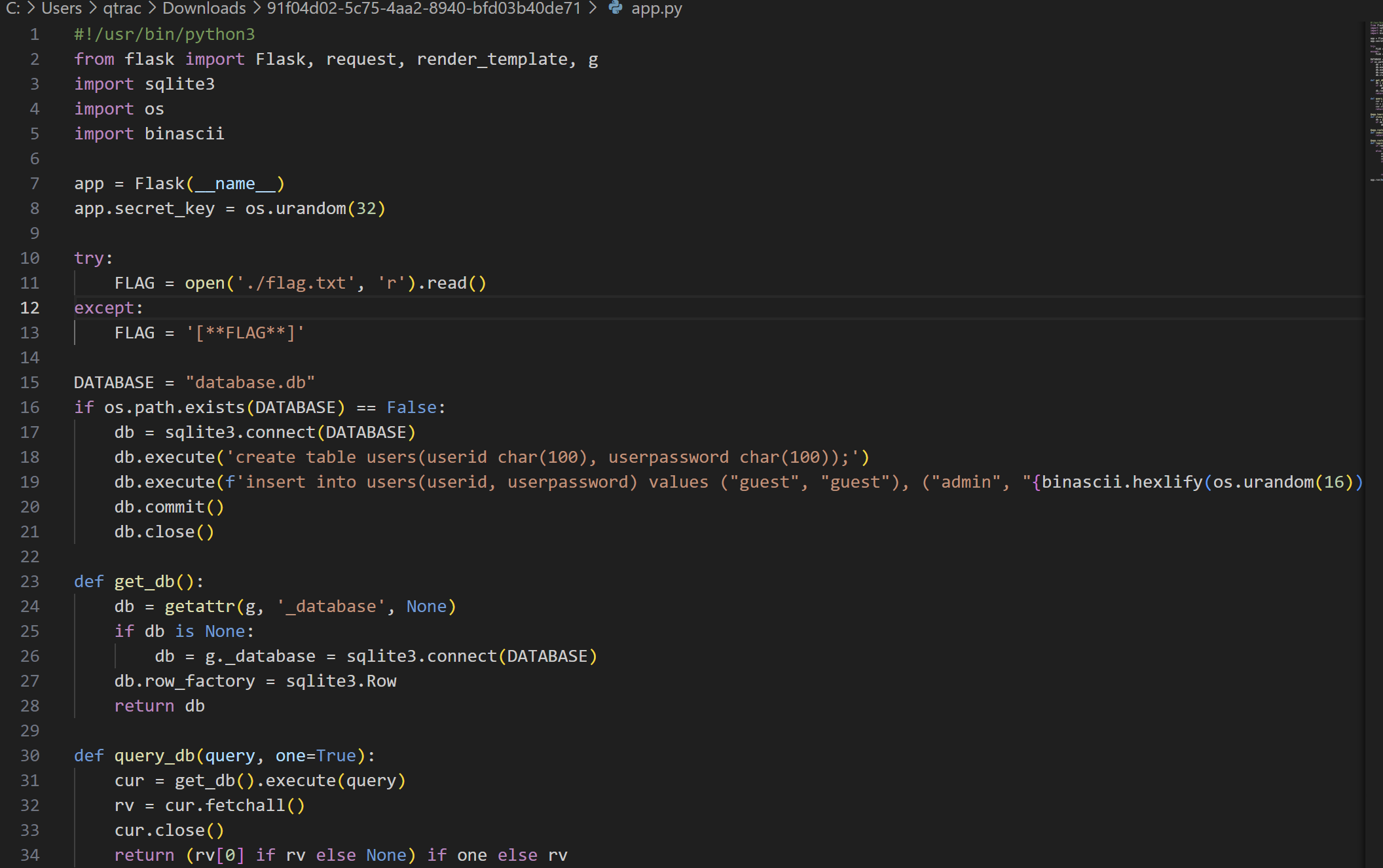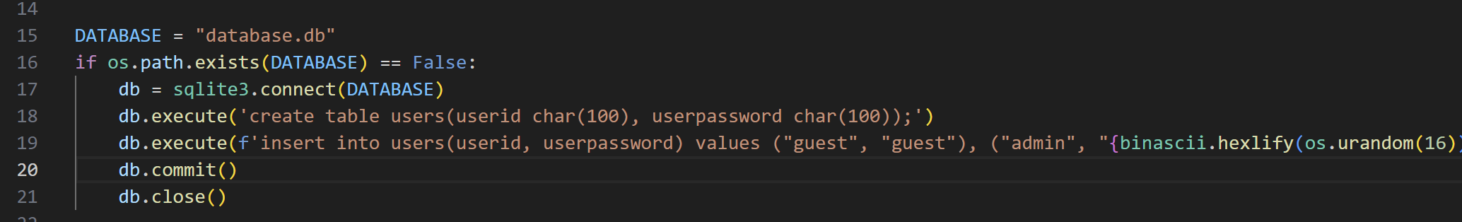 해당 코드를 통해 DB(datatbase)에 query문이 삽입되어 계정이 생성되었음을 볼 수 있었고, admin계정의 암호는 dict 형태로 16진수 난수 형태로 생성됨을 파악할 수 있었습니다.(binascii.hexlify : binary 데이터 16진수 표현법)