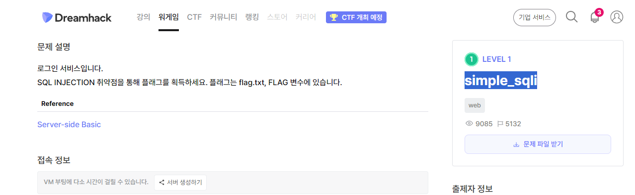 해당 문제를 풀기 위해서는 이전에도 그랬던 것처럼 서버를 생성하고 문제 파일을 다운로드해야 합니다.