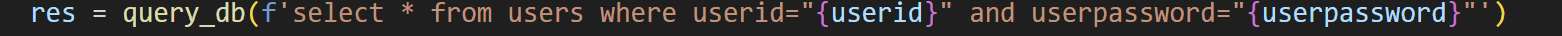 SQL 쿼리를 해석해보면, users 테이블에 입력한 uesr id와 userpassword가 일치하는 데이터를 조회한다는 사실을 알 수 있었습니다.