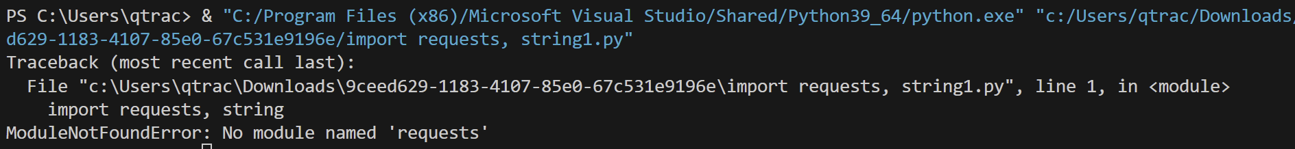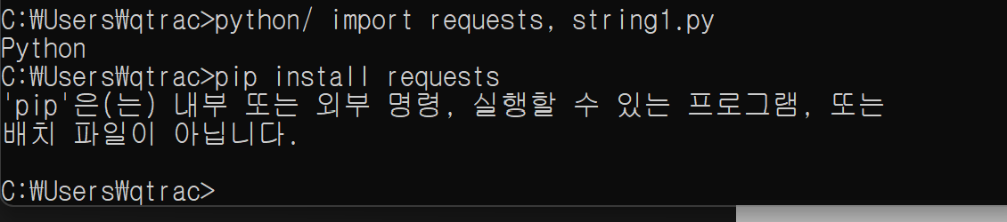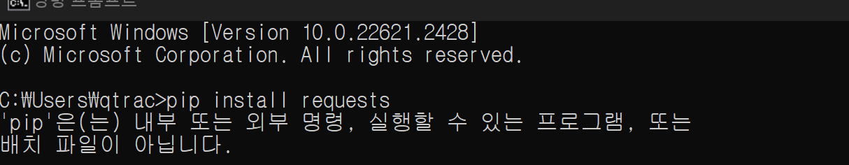 requests 모듈이 없기에, install 명령어를 통해 설치하고자 하였으나 install 명령어를 이용했음에도 설치가 되지 않는다는 화면이 나타났습니다.