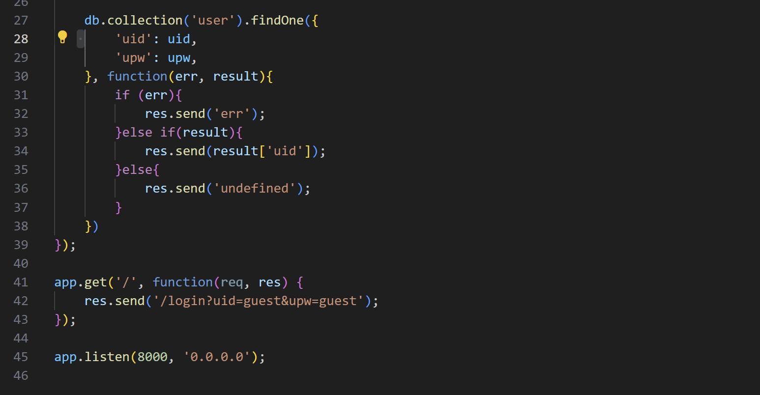 guest 값이 출력되며 uid와 upw가 MongoDB에 들어가는 파라미터 임을 파악할 수 있었습니다.
