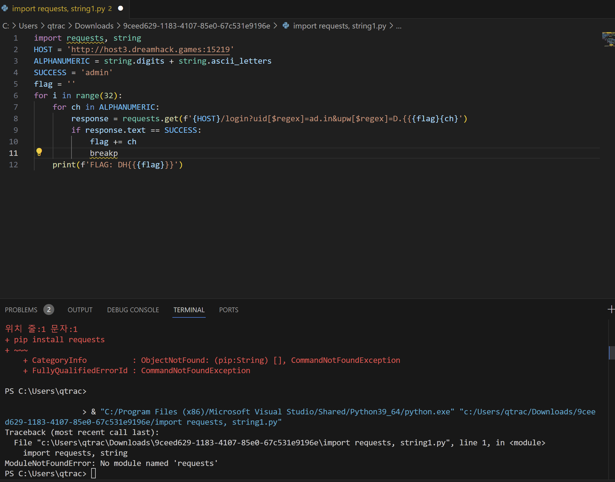 그러나 이번에도 이전과 같이 pip install request 설치에 실패하였다는 것을 알 수 있습니다..