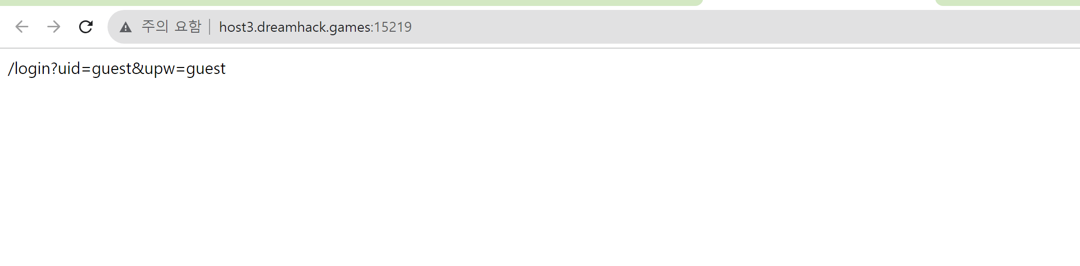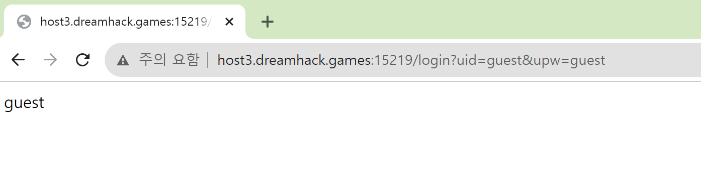 생성된 서버를 클릭해 보니 해당 화면이 나타나며, 문제 서버의 index은 /login?uid=guest&upw=guest이라는 문구를 출력하고 있다는 사실을 알 수 있었습니다.