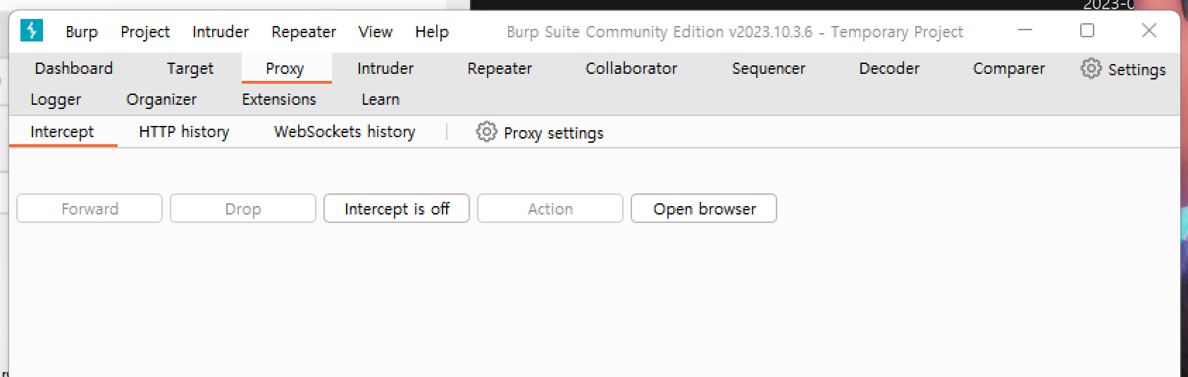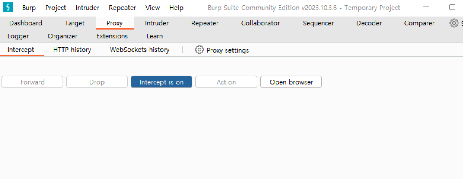 Intercept is off를 Intercept is on 모드로 변경 후 open browser를 클릭해 줍니다.