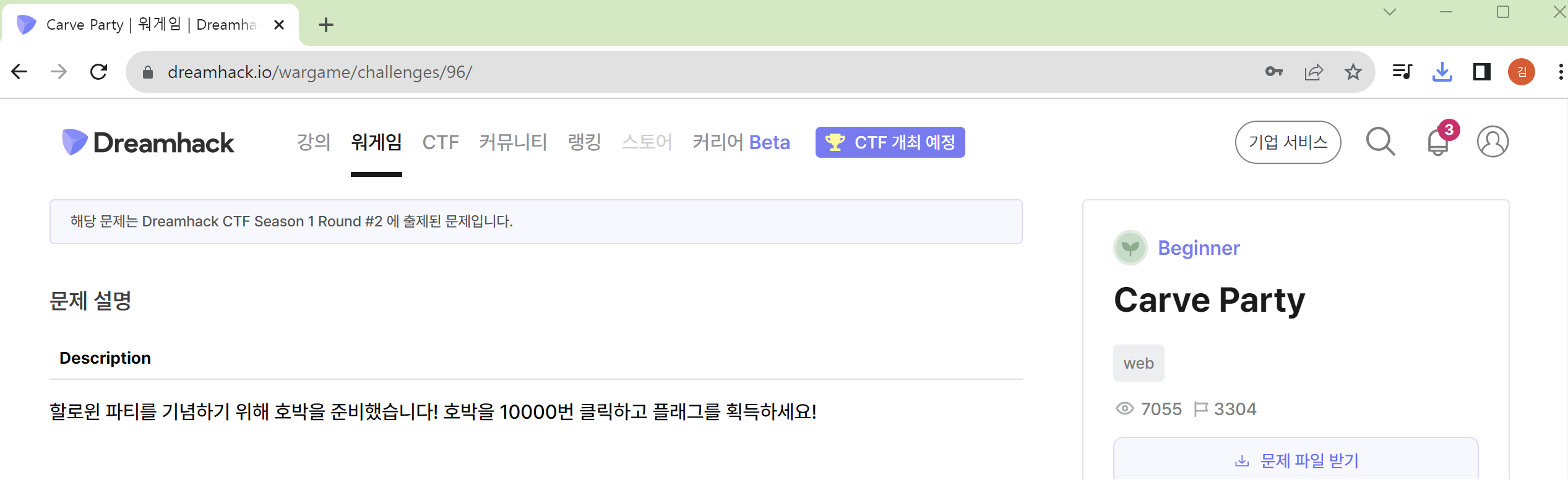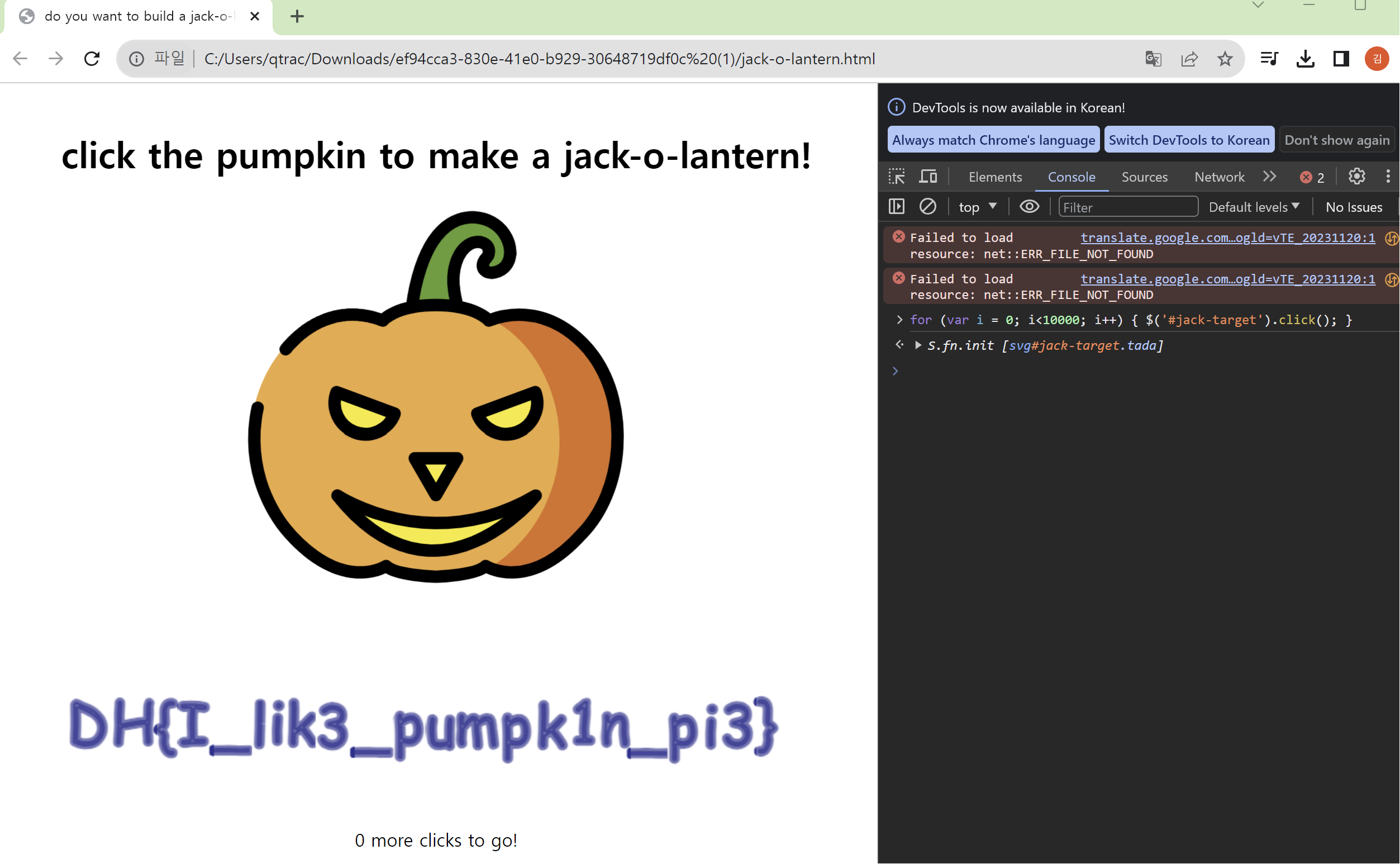 또한 해당 문제는 호박을 '1000번' 클릭하고 flag를 획득하는 문자이므로,