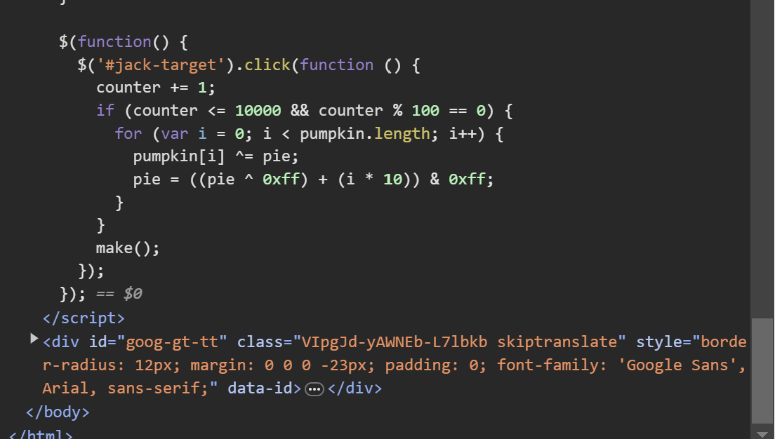 F12 키를 눌러 개발자 도구를 클릭하니, 우리가 호박을 클릭했을 때 실행되는 함수를 살펴볼 수 있습니다.
