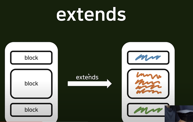 1. extends : 미리 만들어 놓은 내용 (블록) 들을 바탕으로, 나머지 내용들을 채워나간다.