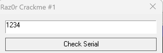 이번에는 틀린 serial number인 1234를 입력해 보았다. 1234를 입력하면 Good job! 의 화면이 아닌, Wrong Serial이라는 화면이 나타난다. (올바른 Serial number가 아니라는 의미)