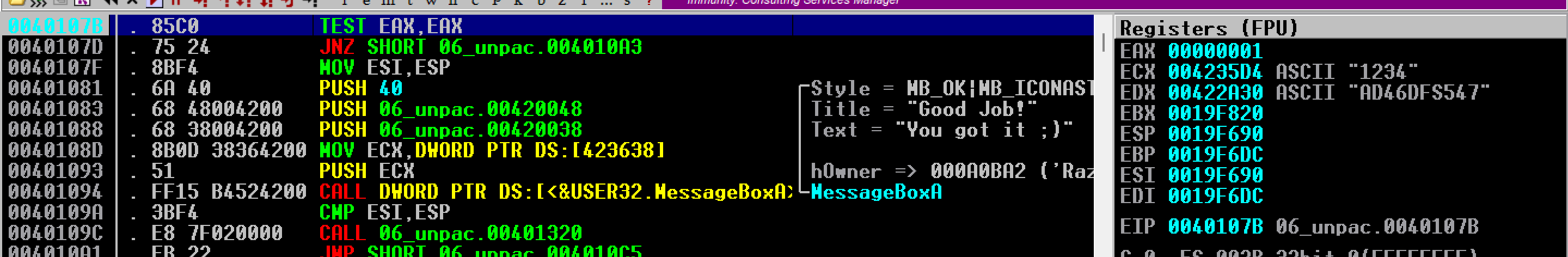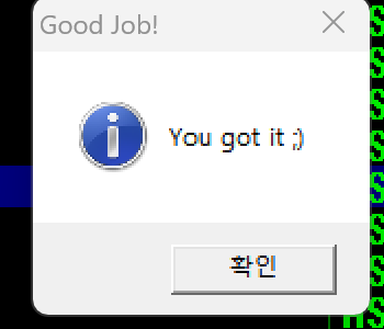 이때 JNZ는 분기하지 않고(점프 조건 불충족), 그대로 다음 명령 실행 → MessageBoxA 호출 → “Good Job! / You got it ;)” 성공 메시지 출력.