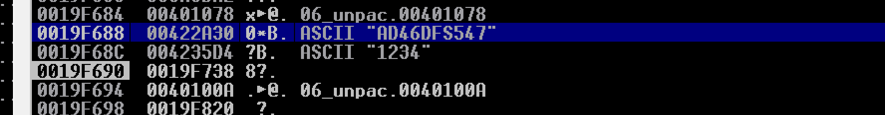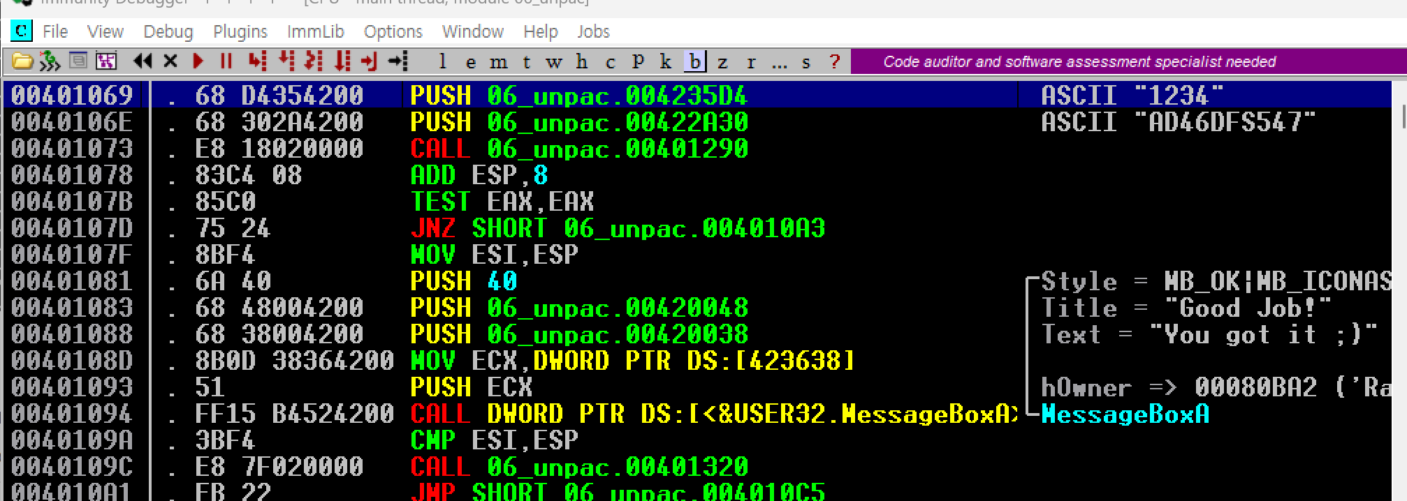 - 위치: 00401069에서 내가 입력한 값("1234")을 스택에 PUSH, 이어서 0040106E에서 정답("AD46DFS547")을 PUSH.