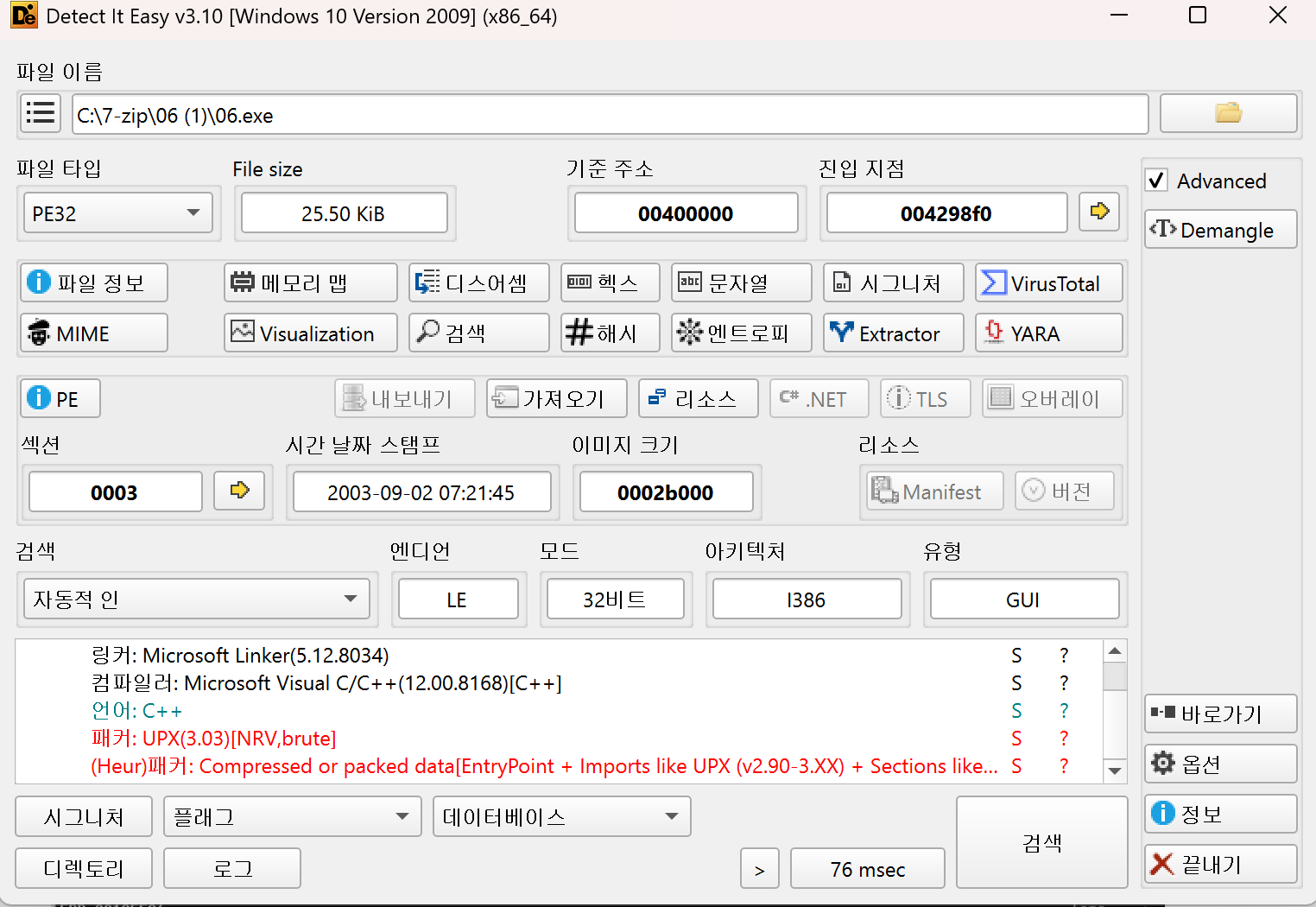 - DIE (Detect It Easy): 실행 파일의 패킹 여부 및 사용된 패커 확인.