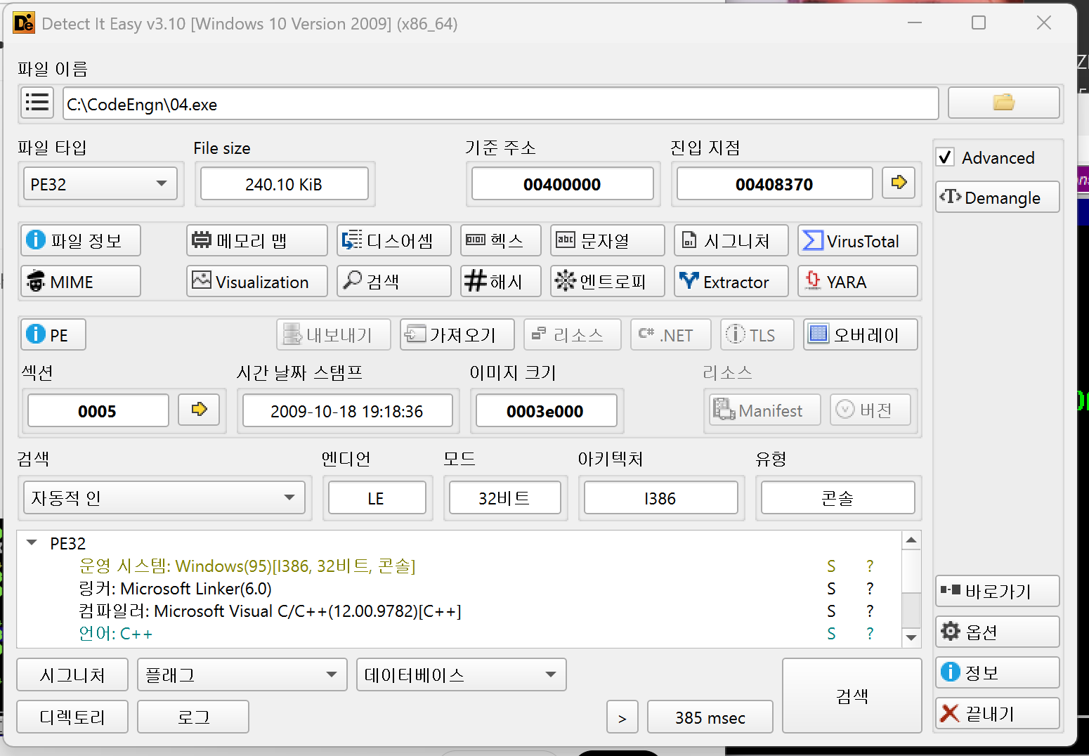 해당 문제를 풀기 위해서는, 먼저 4.exe 파일을 다운로드한 후에 DIE 파일에서 열어준다.