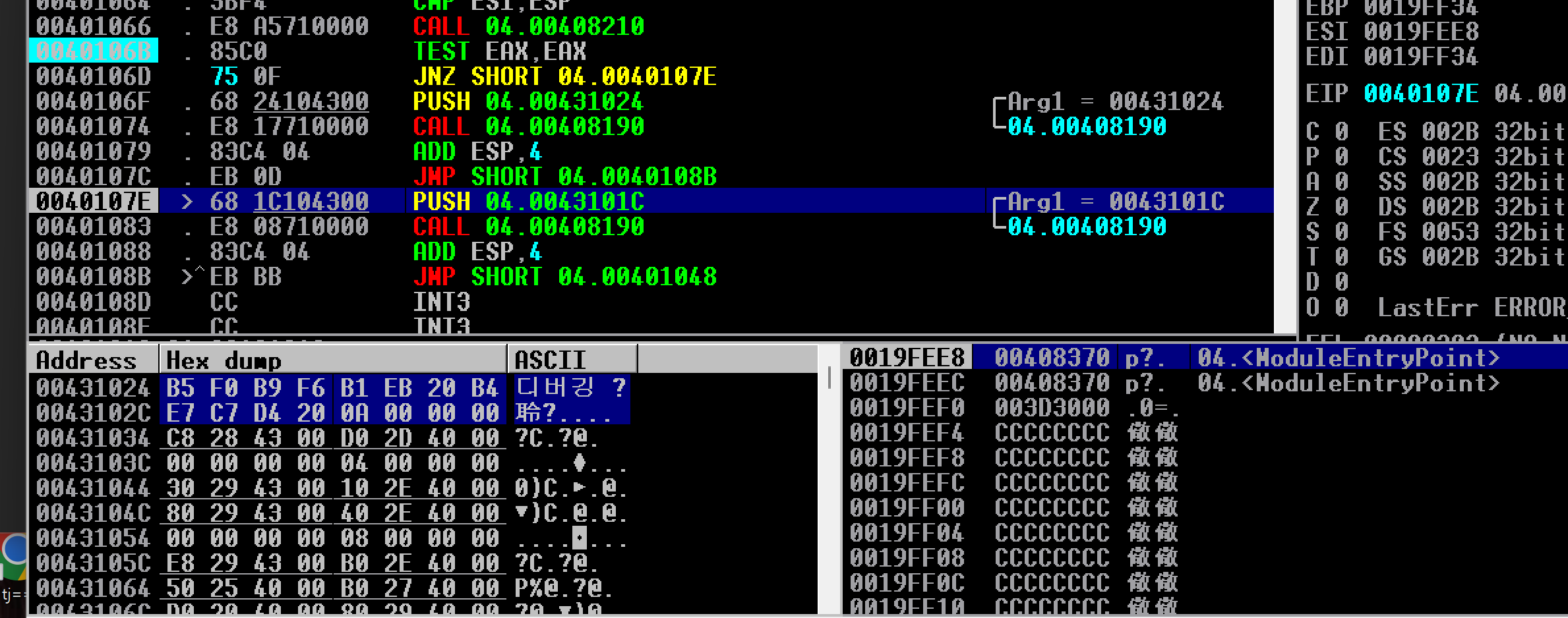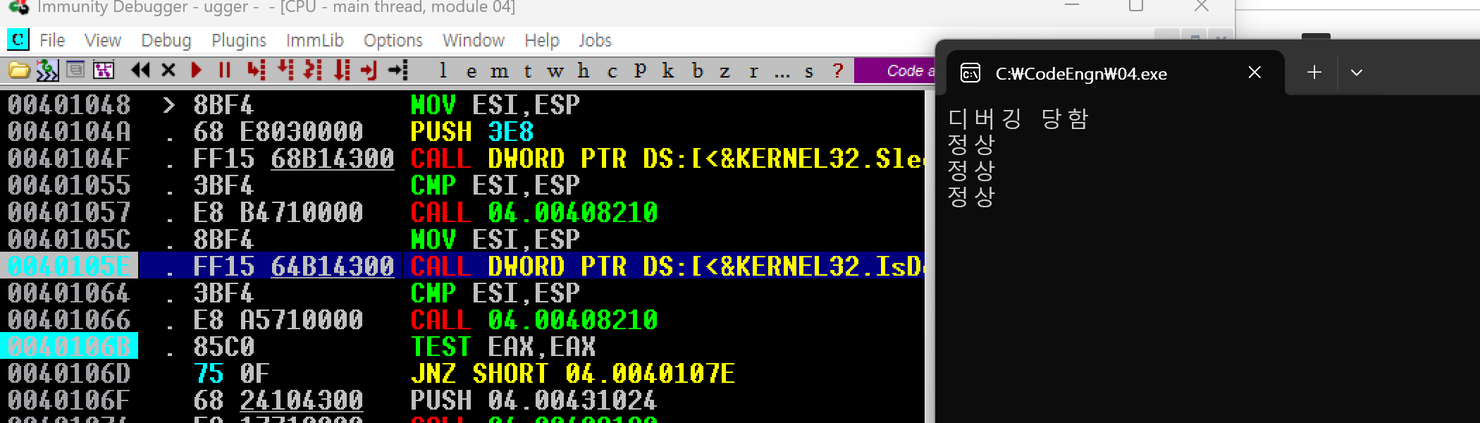 ** 따라서 디버거가 감지된 경우(ZF=0), JNZ 명령이 작동하여 “디버깅 당함” 문자열을 PUSH 하는 코드 부분(0x0040106F 이후)을 건너뛰고, 곧바로 0x0040107E의 “정상” 메시지 출력 코드로 이동한다.