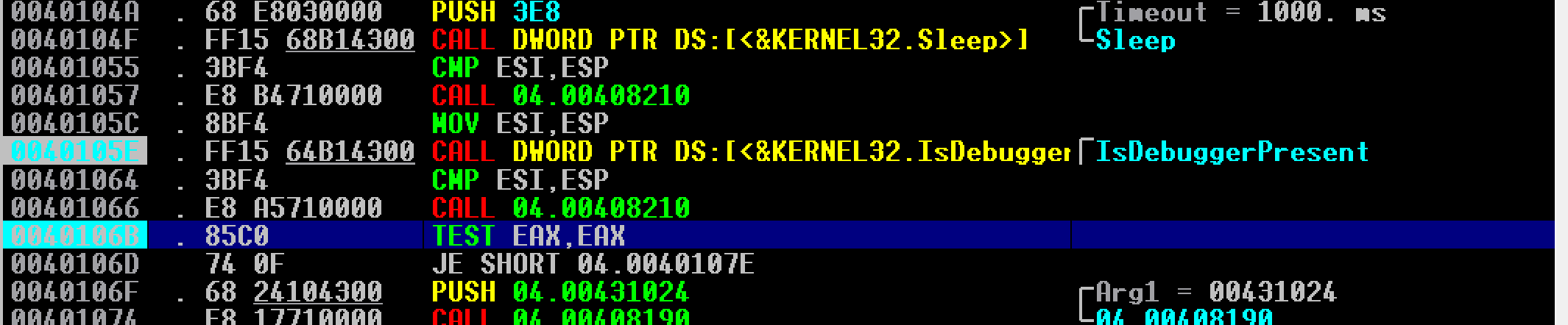 즉, TEST EAX, EAX의 결과가 0이 아닐 때(=디버거가 있을 때) 점프가 발생한다.