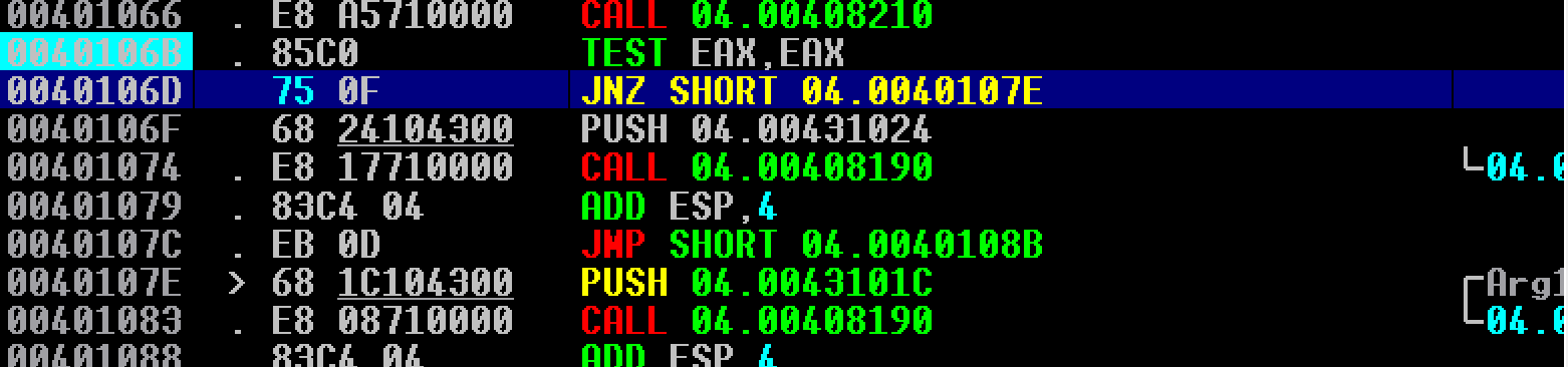 원래 프로그램의 0040106D 주소에는 JE SHORT 0040107E 명령이 존재한다.