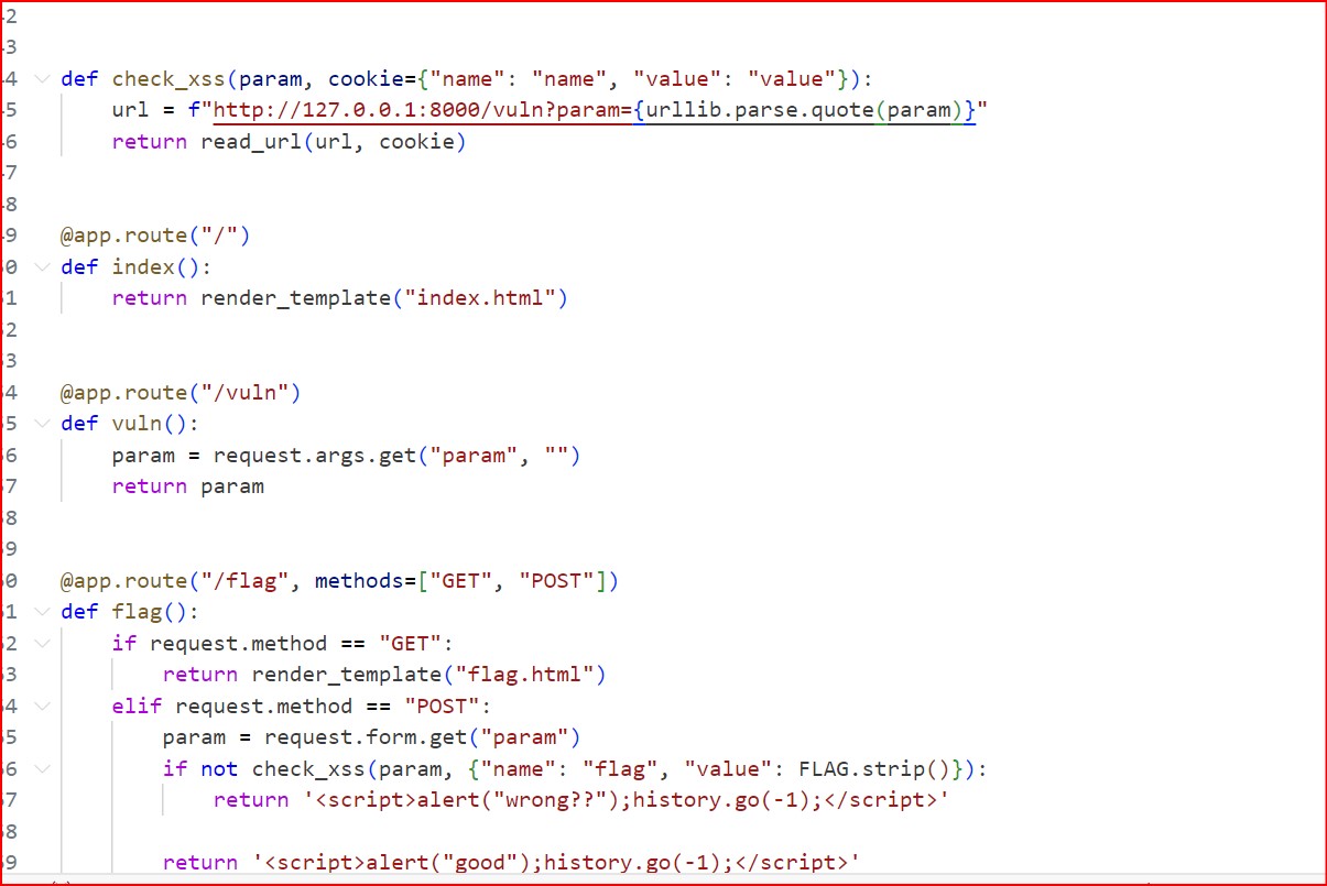 flag()에서 read_url은 read_url(xss, {'name': 'flag', 'value': FLAG})로 작성되어 있다는 사실을 알 수 있습니다.