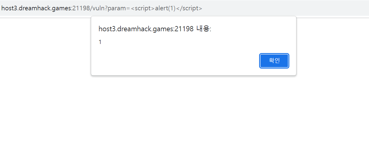 첫 번째로는, 필터링이 없어서 xss가 가능한 vuln 함수 page 화면이 나타납니다. xss 파라미터로 입력된 값을 전송하면, 페이지 응답 시 해당 변수가 페이지 내 삽입됩니다. 위 과정에서는 xss 파라미터 값으로 스크립트 구문이 삽입되어, 페이지 응답 시 해당 스크립트가 동작하게 됩니다.