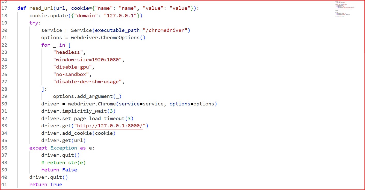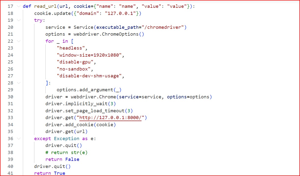 flag 페이지에서는 read_url 함수를 실행시키며 함수 정상 동작 시 "good" 알람창을 띄운다는 사실을 알 수 있습니다. 또한 real_url 함수를 살펴보면, 해당 함수에서 쿠기가 생성되고 domain의 번호가 (127.0.0.1:8000)이라는 것을 알 수 있습니다.