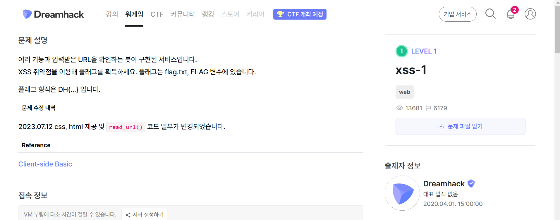 xss - 1 문제를 풀기 위해서는 문제 파일을 다운로드하고 서버 생성하기 버튼을 클릭해줘야 합니다.