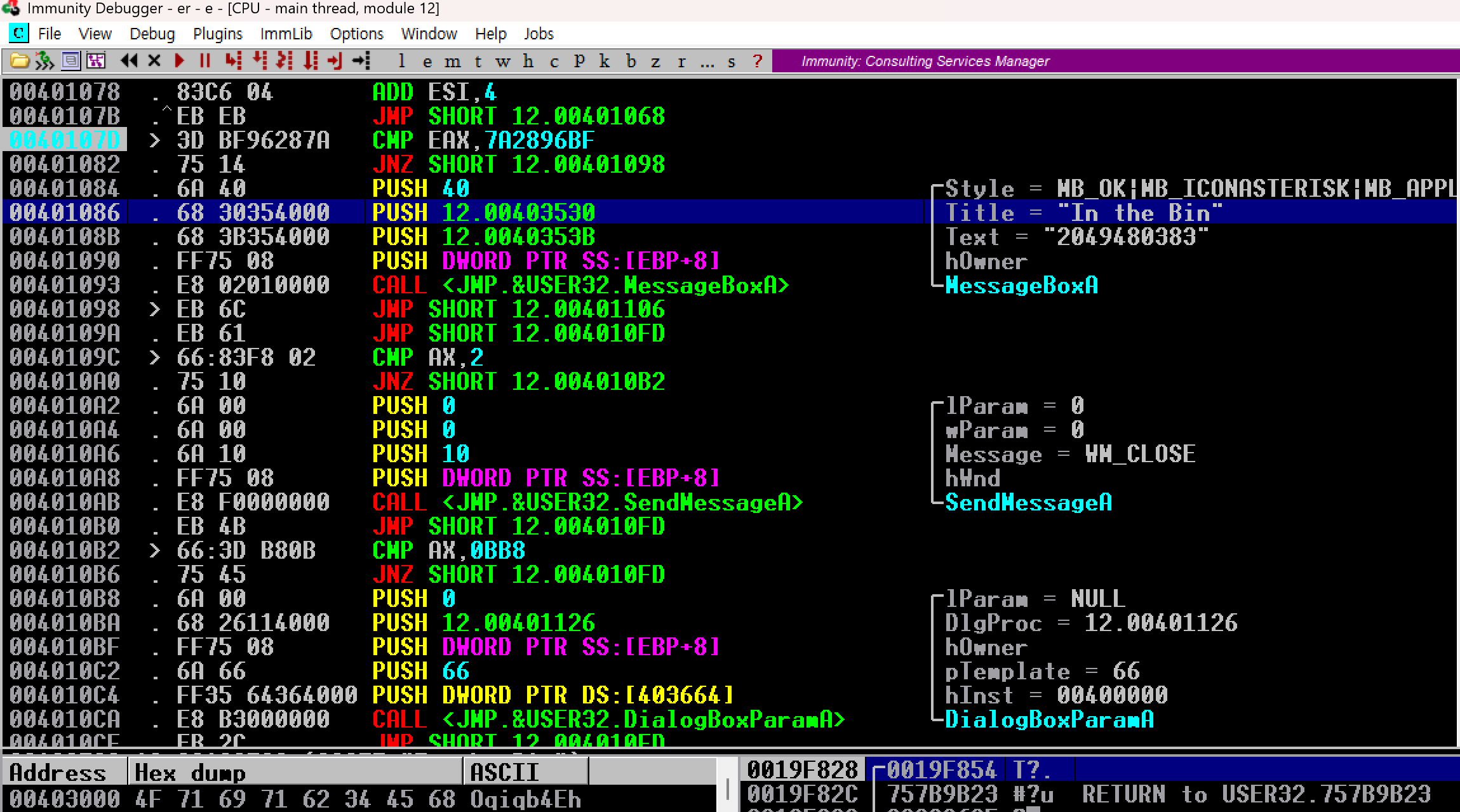 MessageBoxA()가 출력되는 구문의 근처 코드로 이동하였다.