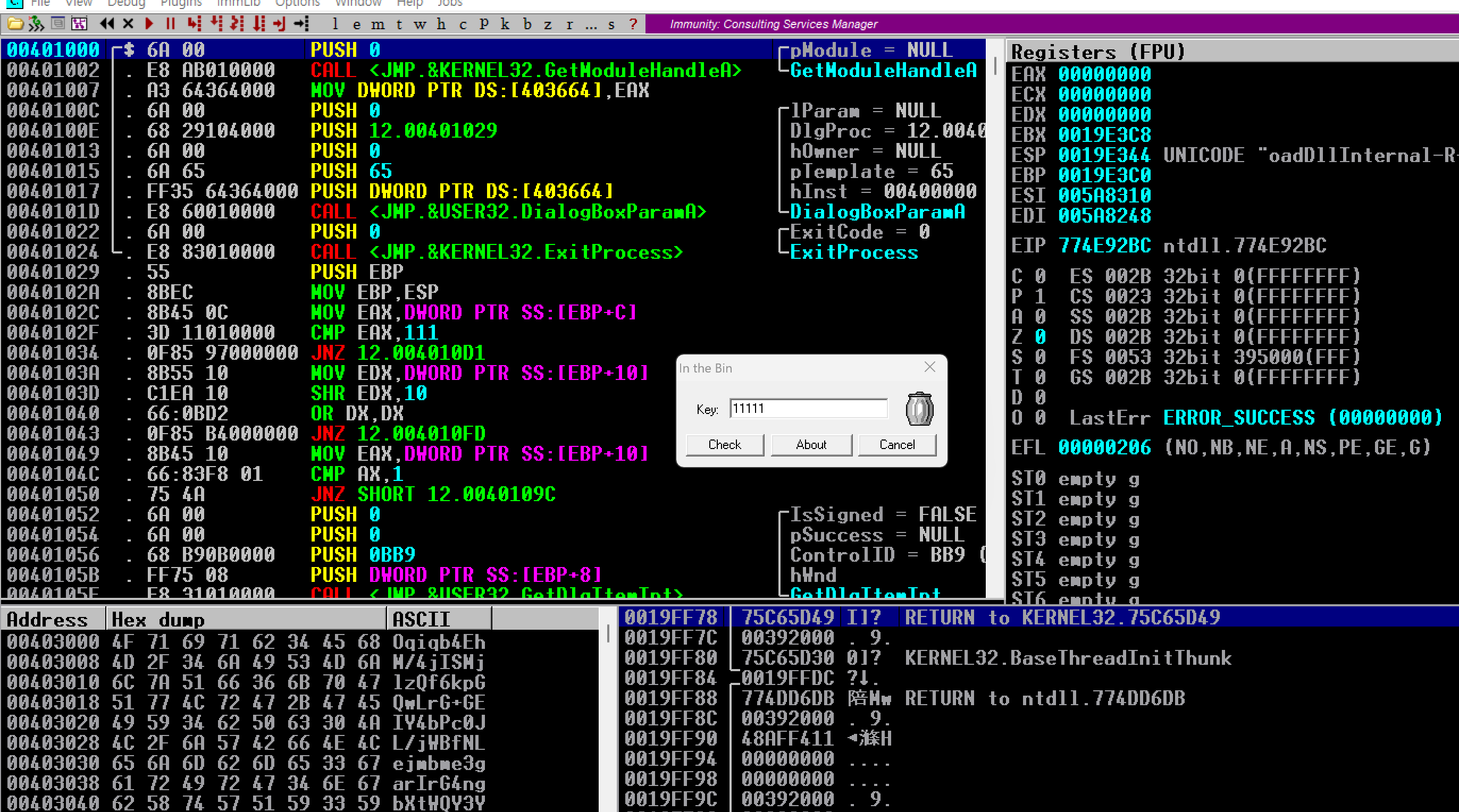 GetModuleHandleA → DialogBoxParamA 순으로 키 입력 다이얼로그를 생성한다는 것을 알 수 있었다.