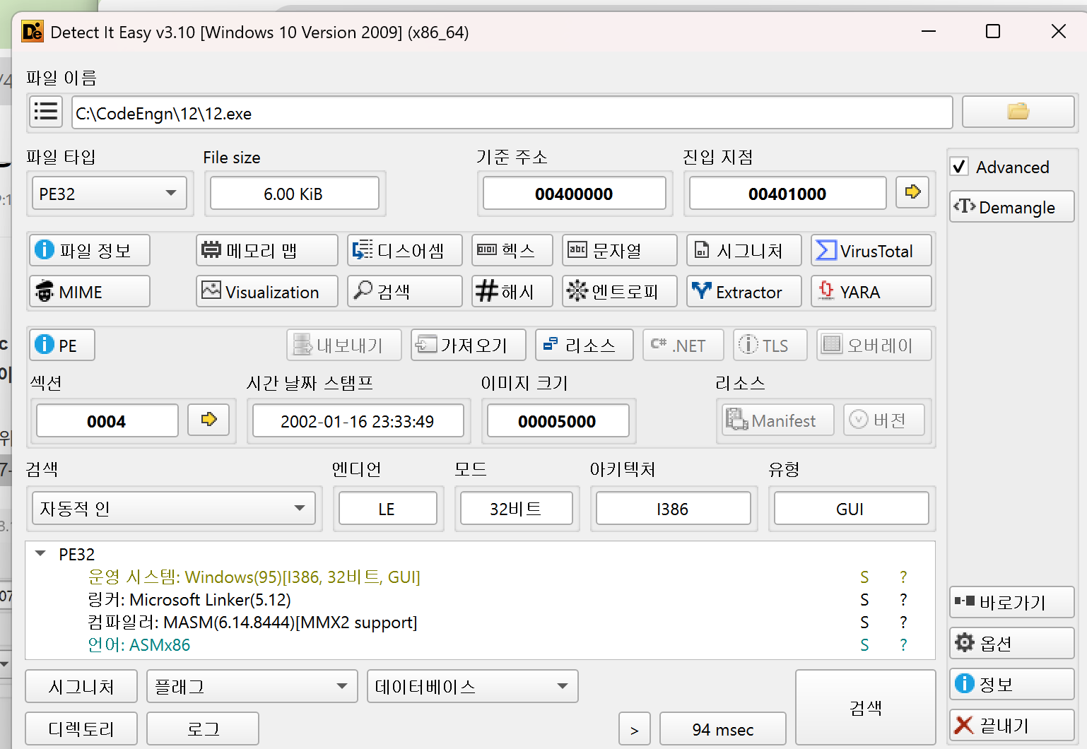 DIE를 통해서, 해당 파일이 UPX로 패킹이 되어 있지 않다는 사실을 알 수 있다.