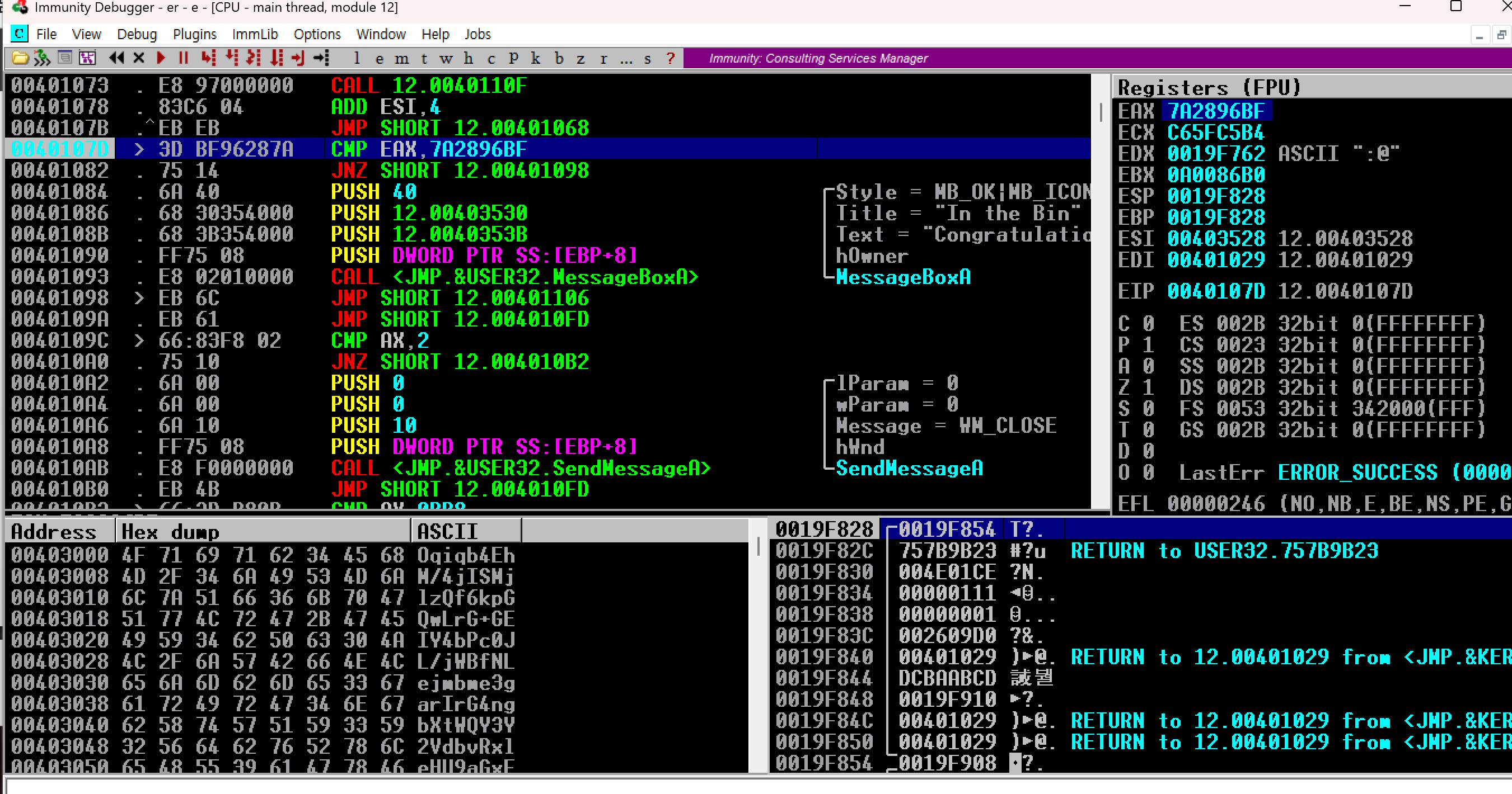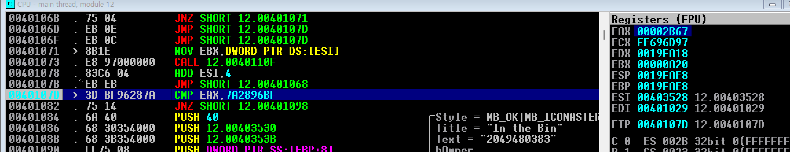 - EAX == 0x7A2896BF 이면 점프하지 않고 성공 경로(= 성공 메시지 출력)