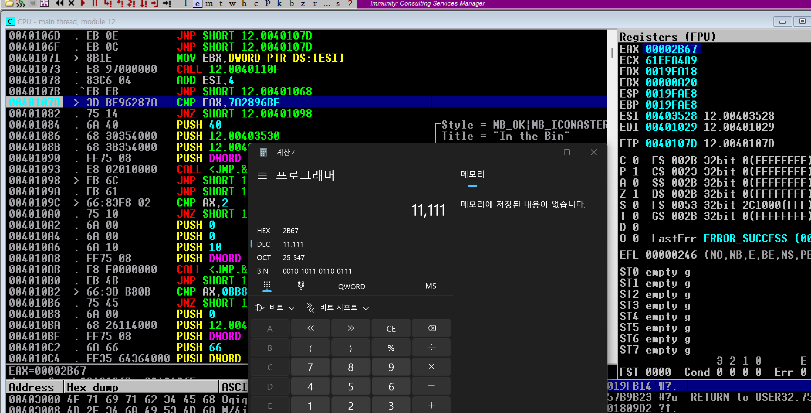 분기 위치(0040107D)에 BP 설정 → F9 실행 -> 다이얼로그에 11111 입력 후 멈춘 시점 레지스터 확인.