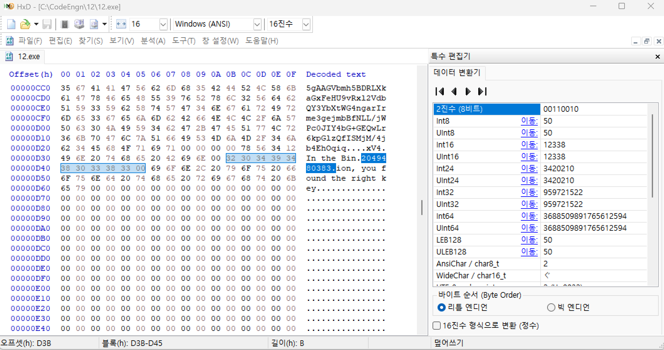 - HxD로 12.exe 파일을 열어 성공 메세지 문자열이 있는 구간을 찾아보았다.
