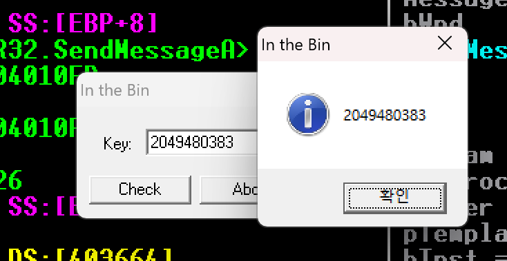 - 수정 후 저장 → 실행하면, → Congratulation (성공 메시지) 대신에 2049480383 (key 값) 이 MessageBox의 텍스트로 출력되는 것을 확인할 수 있었다.