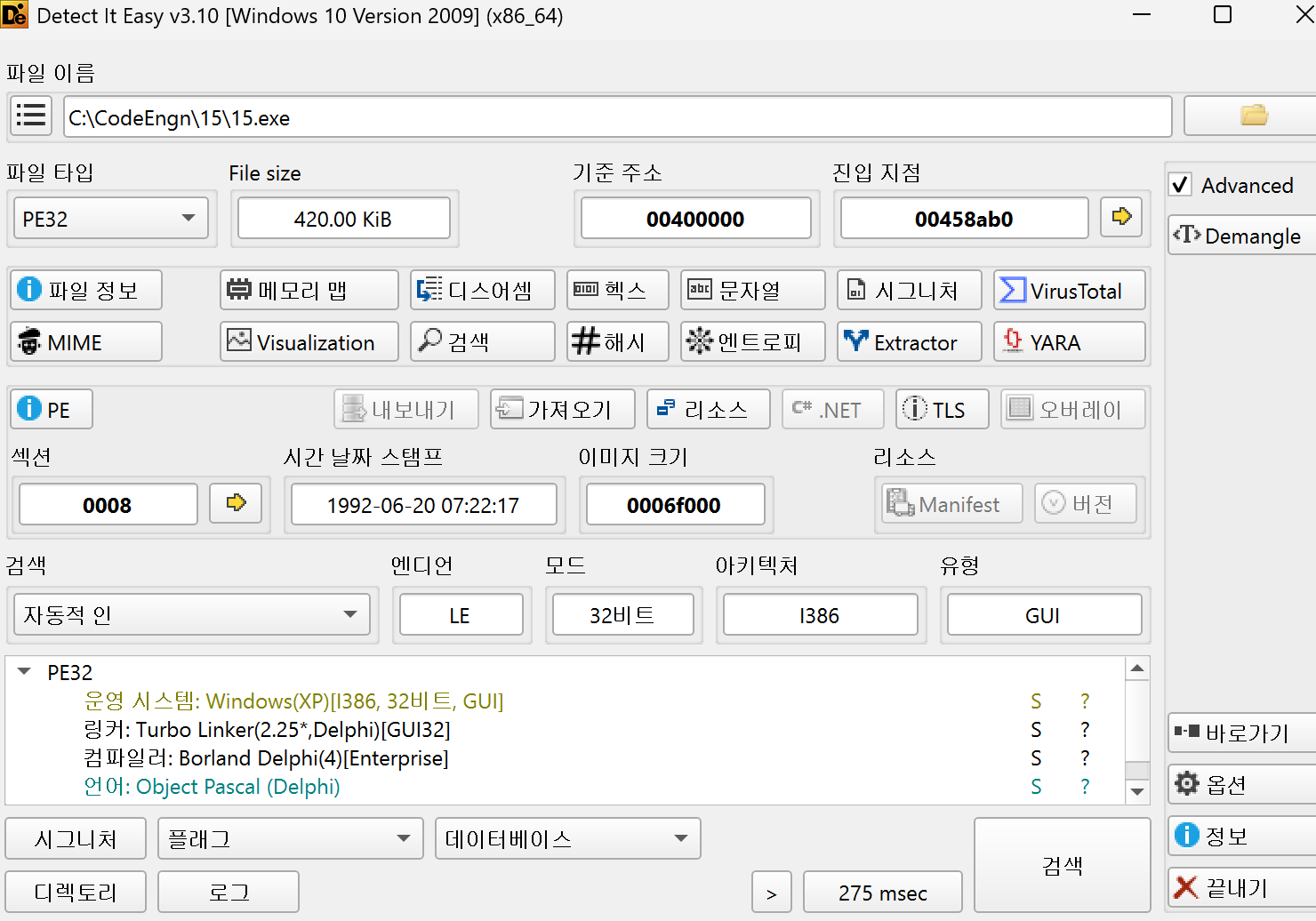 DIE를 통해서, 해당 파일이 UPX로 패킹이 되어 있지 않다는 사실을 알 수 있다.