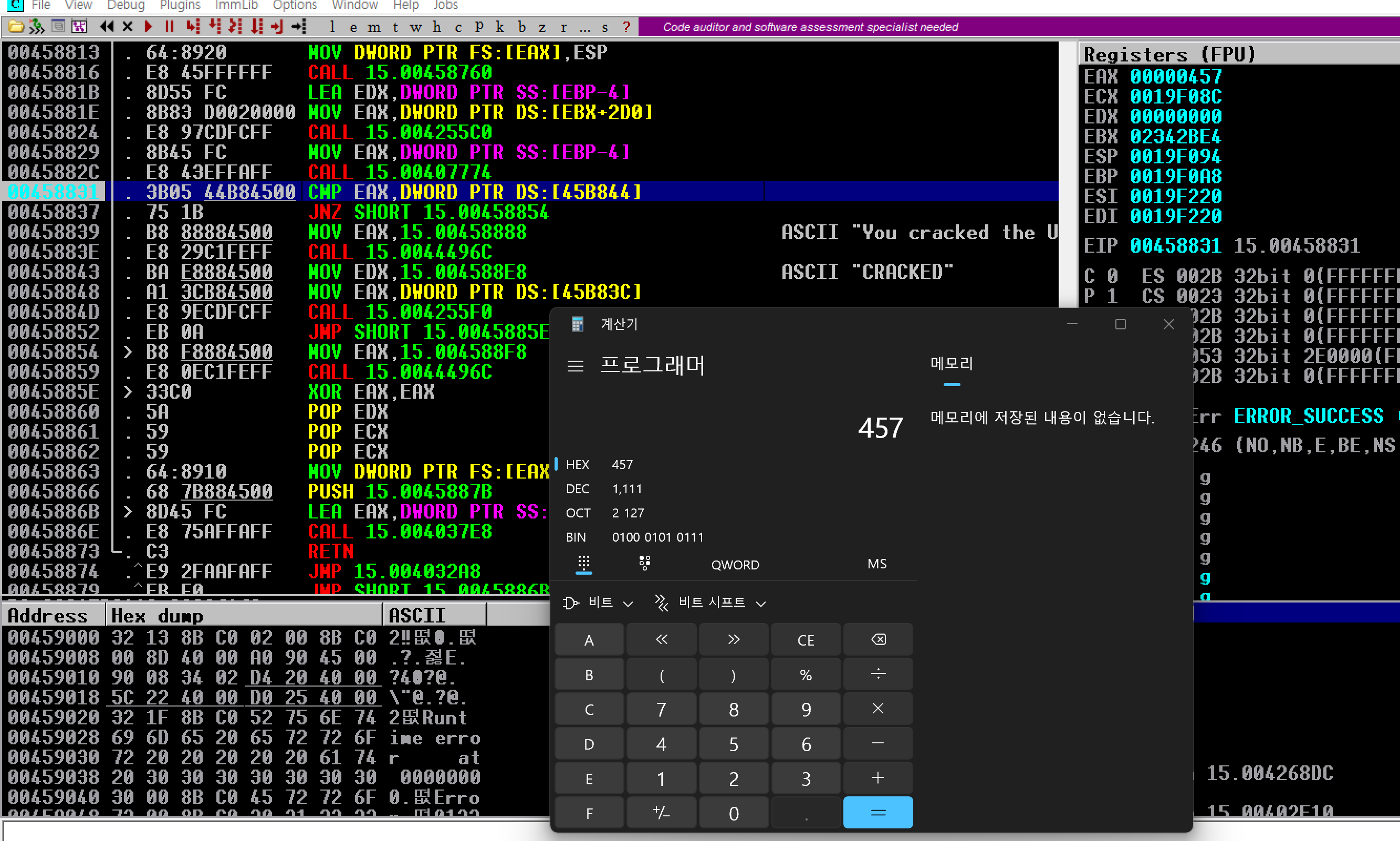 - 1111 입력 시 EAX = 0x0457→ 디버거는 16진으로 보여주므로,