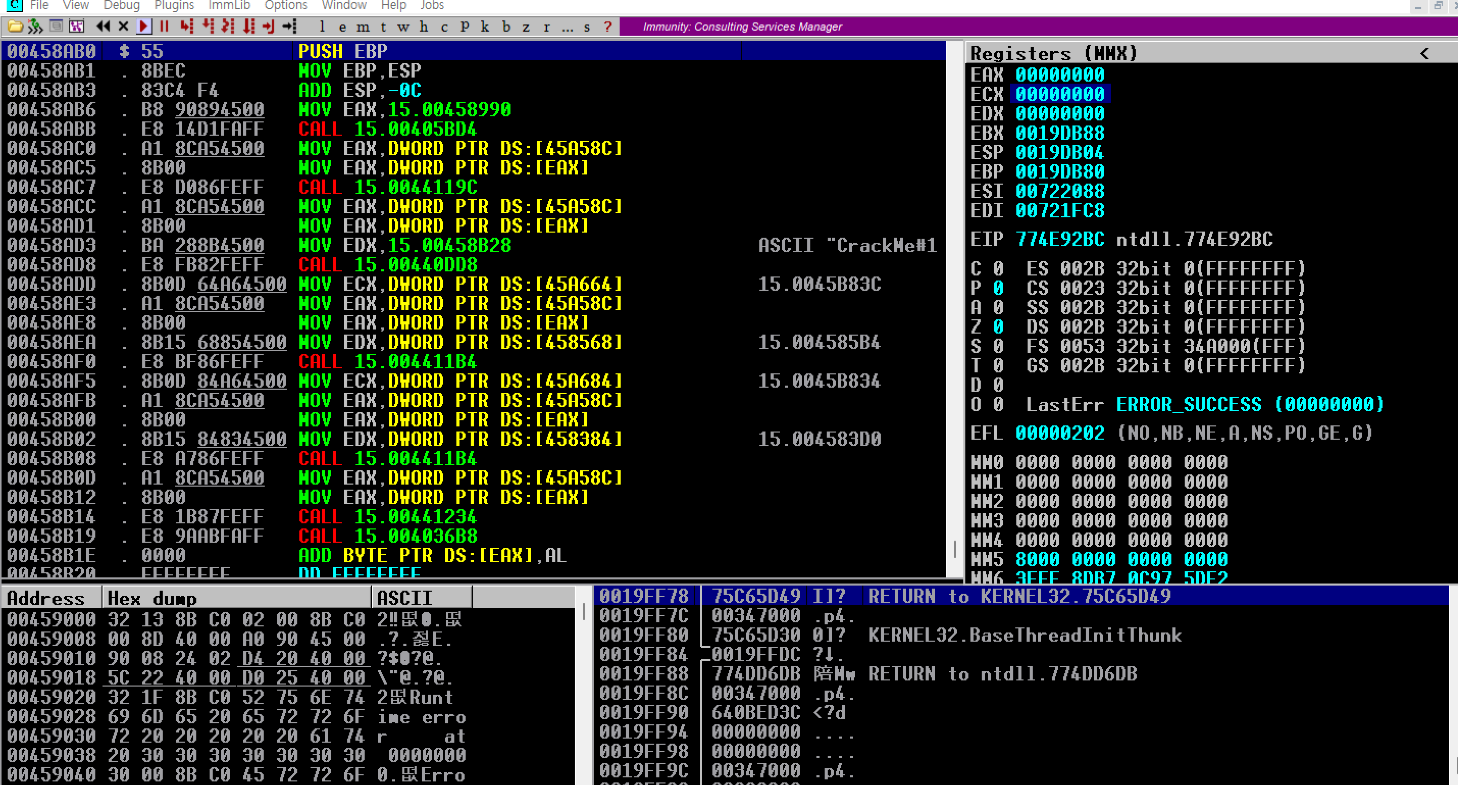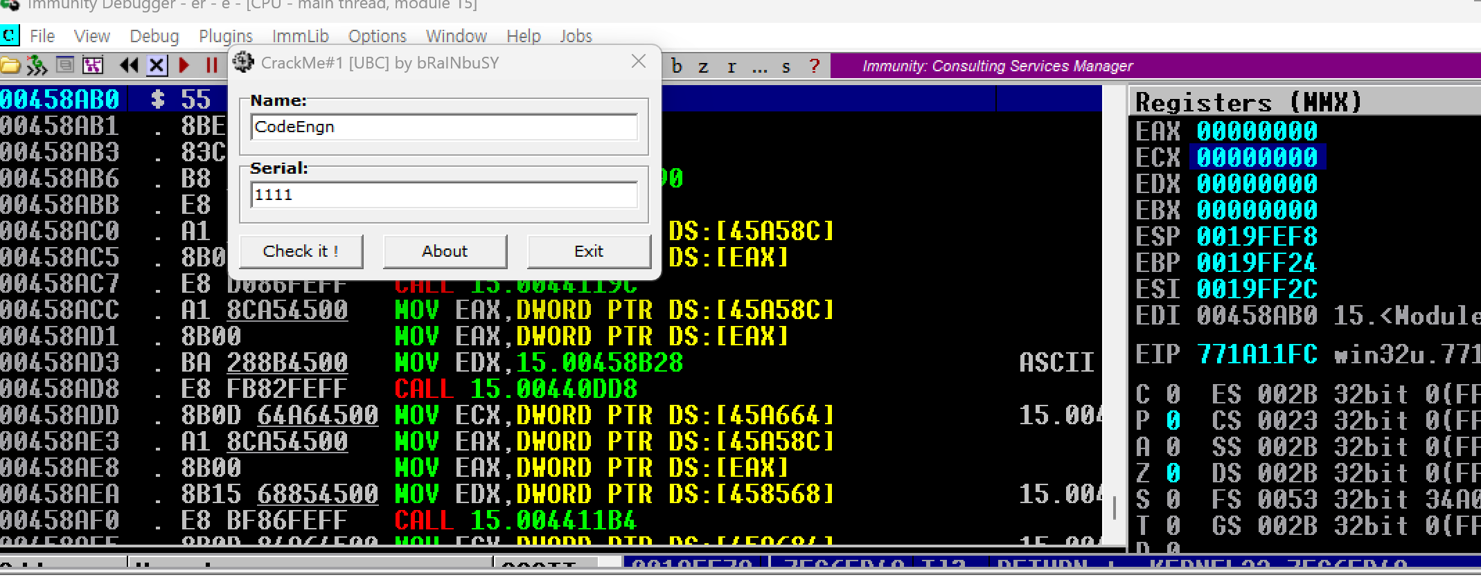 -> Name=CodeEngn, Serial=1111 입력 후 정지 시점에서 레지스터/메모리 확인
