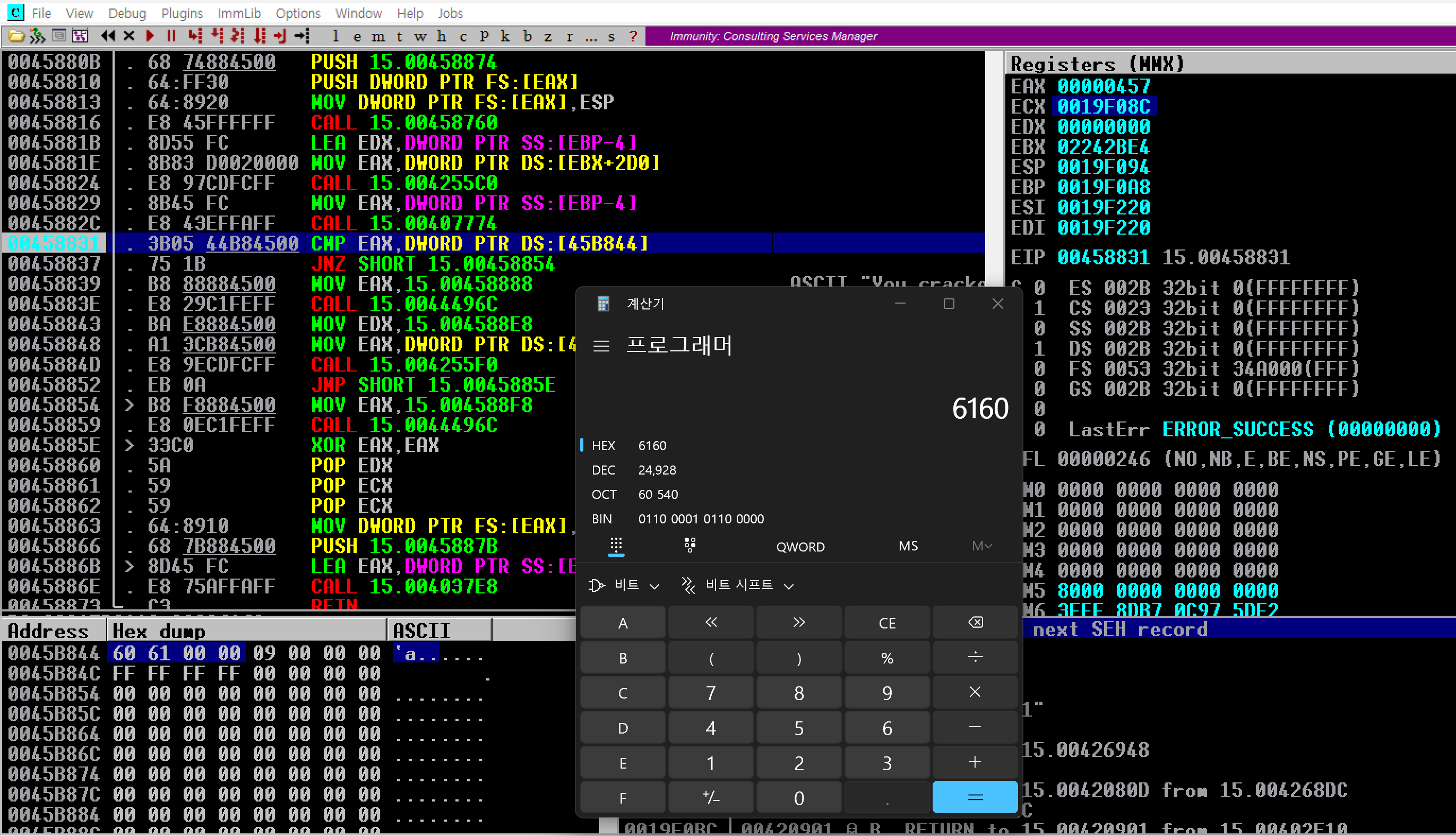 - 곧, EAX == [45B844] 을 만족해야 바로 성공 메시지가 뜬다는 것이 핵심이다.