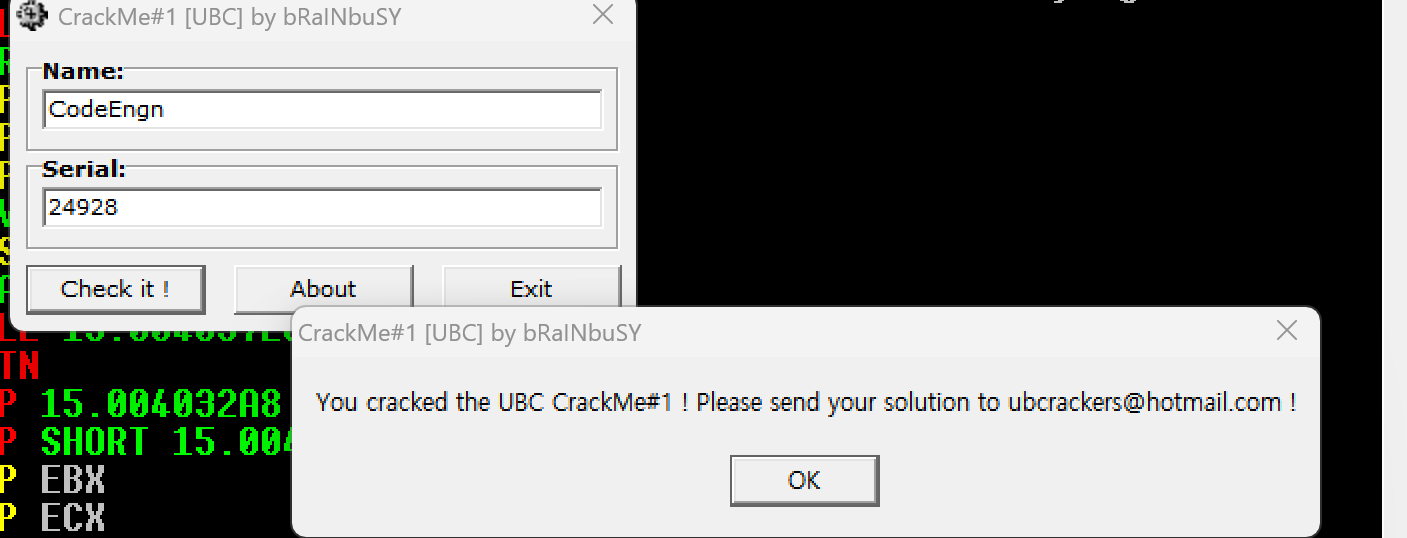 이를 토대로, Name: CodeEngn, Serial: 24928 입력 →