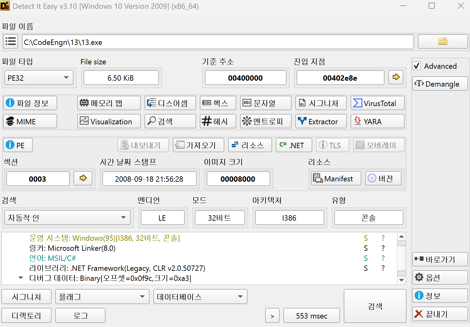 DIE 결과, 이 파일은 . NET Assembly로 제작된 프로그램임을 알 수 있었다.