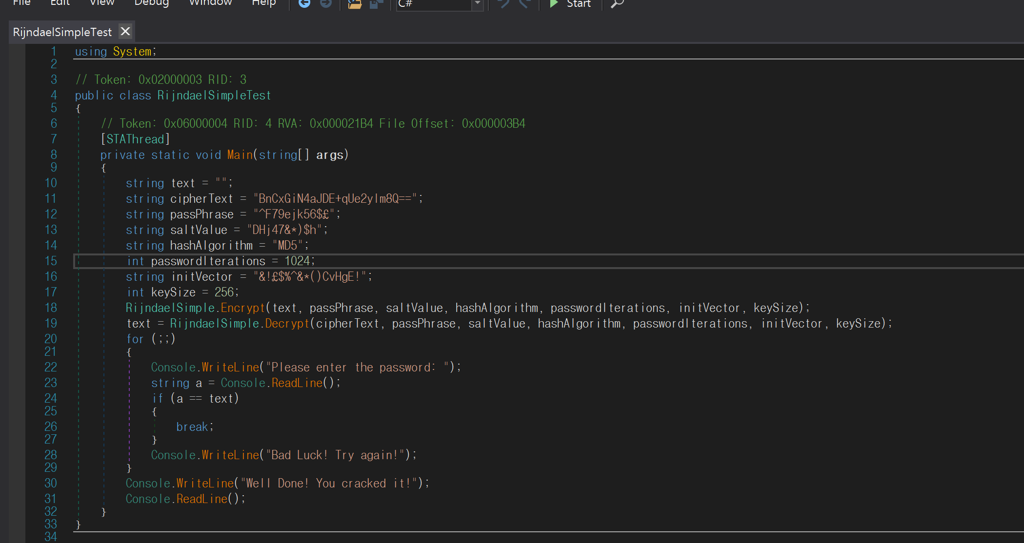 text = RijndaelSimple.Decrypt(cipherText, passPhrase, saltValue,