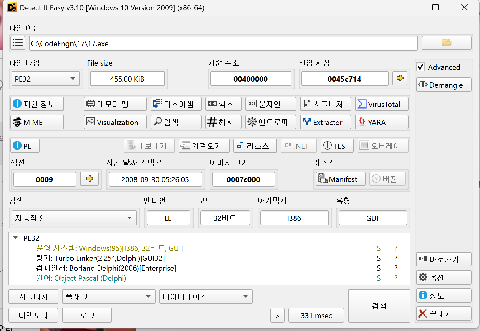 DIE를 통해서, 해당 파일이 UPX로 패킹이 되어 있지 않다는 사실을 알 수 있다.