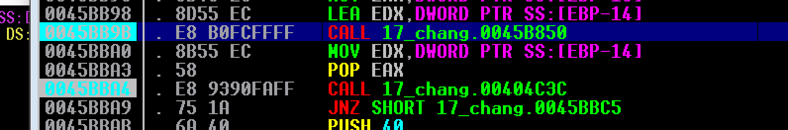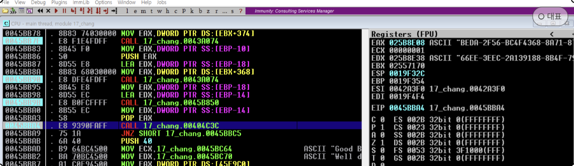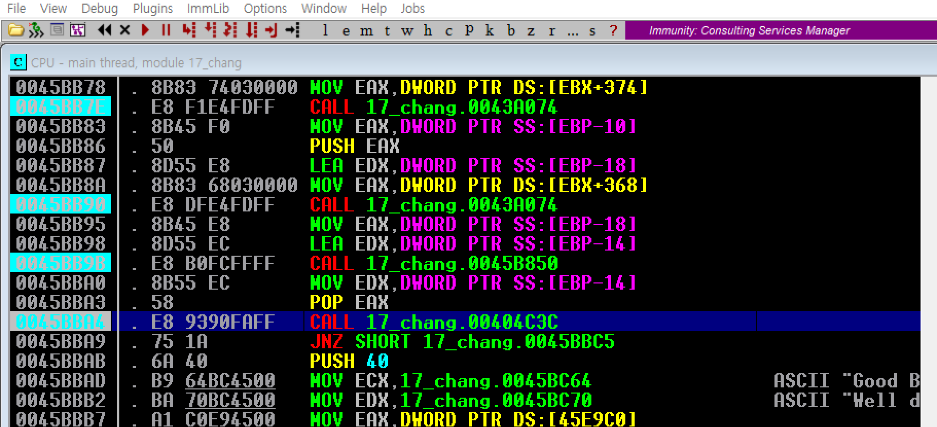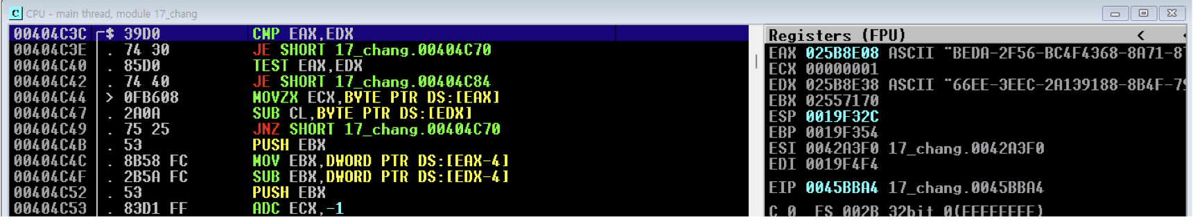 0045BBA4 CALL 17_chang.00404C3C ; 내부 Key와 사용자가 입력한 Key 비교
