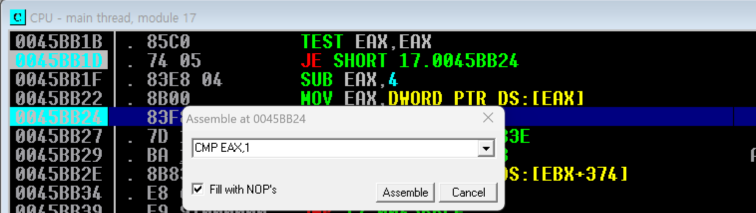 0045BBA9 JNZ SHORT 17_chang.0045BBC5 ; 다르면 실패 경로로 점프