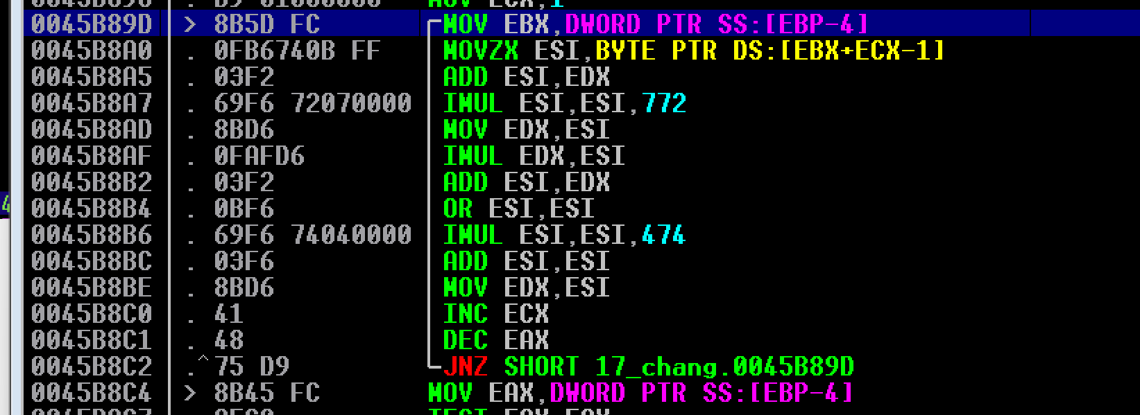 0045B8A0 MOVZX ESI,BYTE PTR DS:[EBX+ECX-1] ; Name[ECX-1] 문자 1바이트 로드