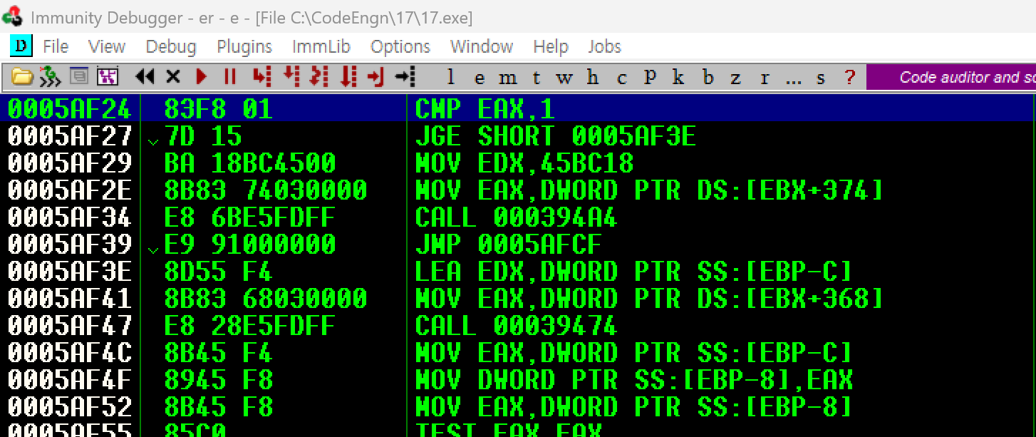 F8(Step over)로 한 단계씩 실행하며, 비교 직전 레지스터 상태를 보면: