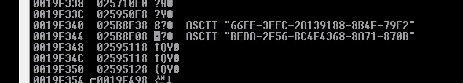 → "BEDA-2F56-BC4F4368-8A71-870B" 가 들어 있는 버퍼 주소 - EDX : Name을 이용해 프로그램이 계산한 내부 Key