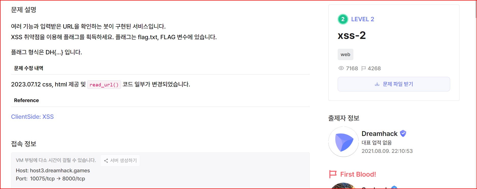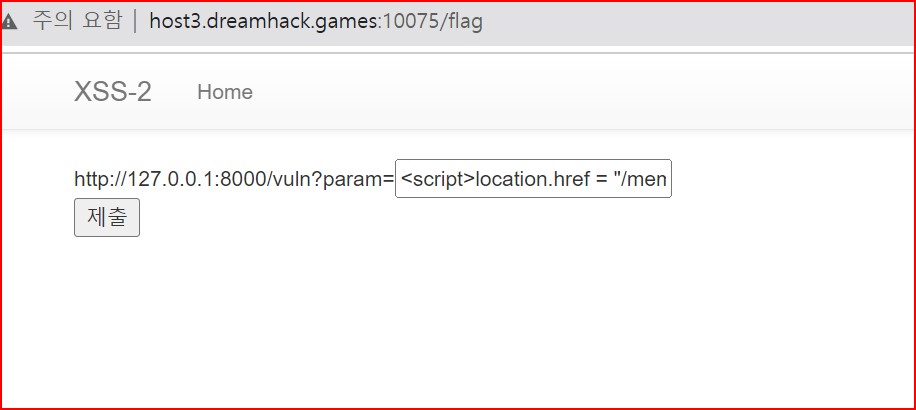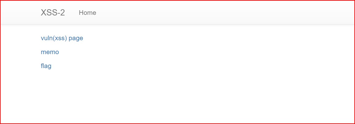 또한 서버 생성하기 버튼을 클릭하여 홈페이지에 접속하였을 때, xxs-1 과 동일하게 vuln(xss) , memo , flag 총 3개의 페이지가 존재한다는 것을 알 수 있습니다.