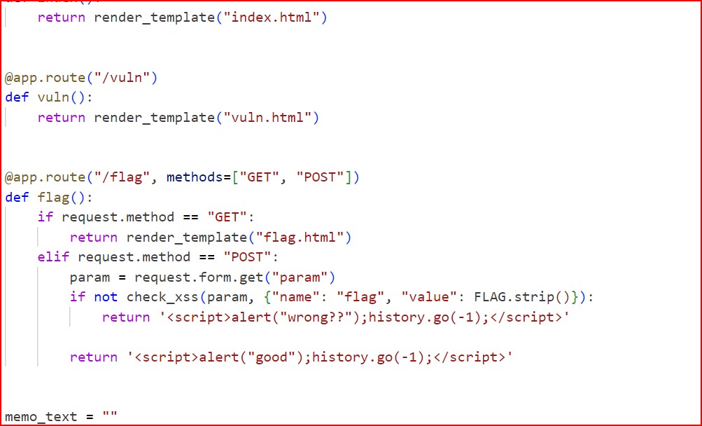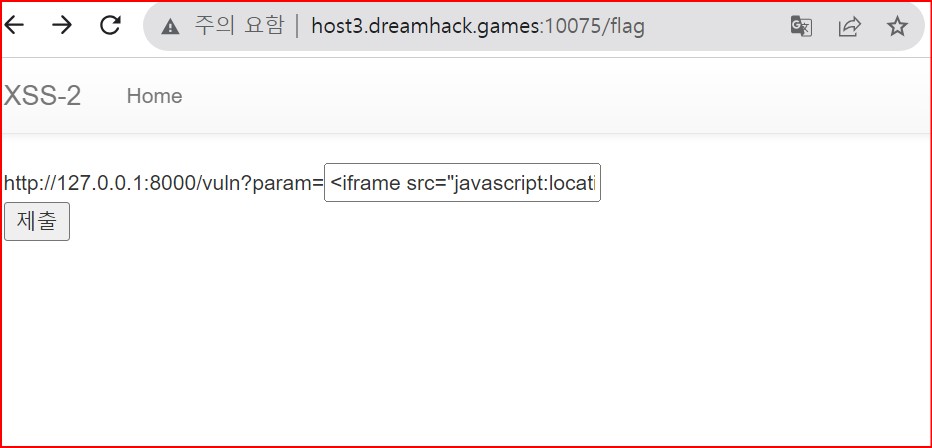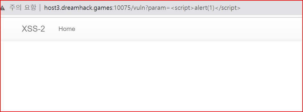 코드를 살펴보면, 전체적인 코드는 xss-1과 동일하였으나, xxs-1 코드에서는 vuln에서 param을 return 하는 코드가 포함되어있었지만 xxs-2 코드에서는 vuln에서 param을 return 하는 코드가 제외되었다는 차이점을 알아볼 수 있었습니다.