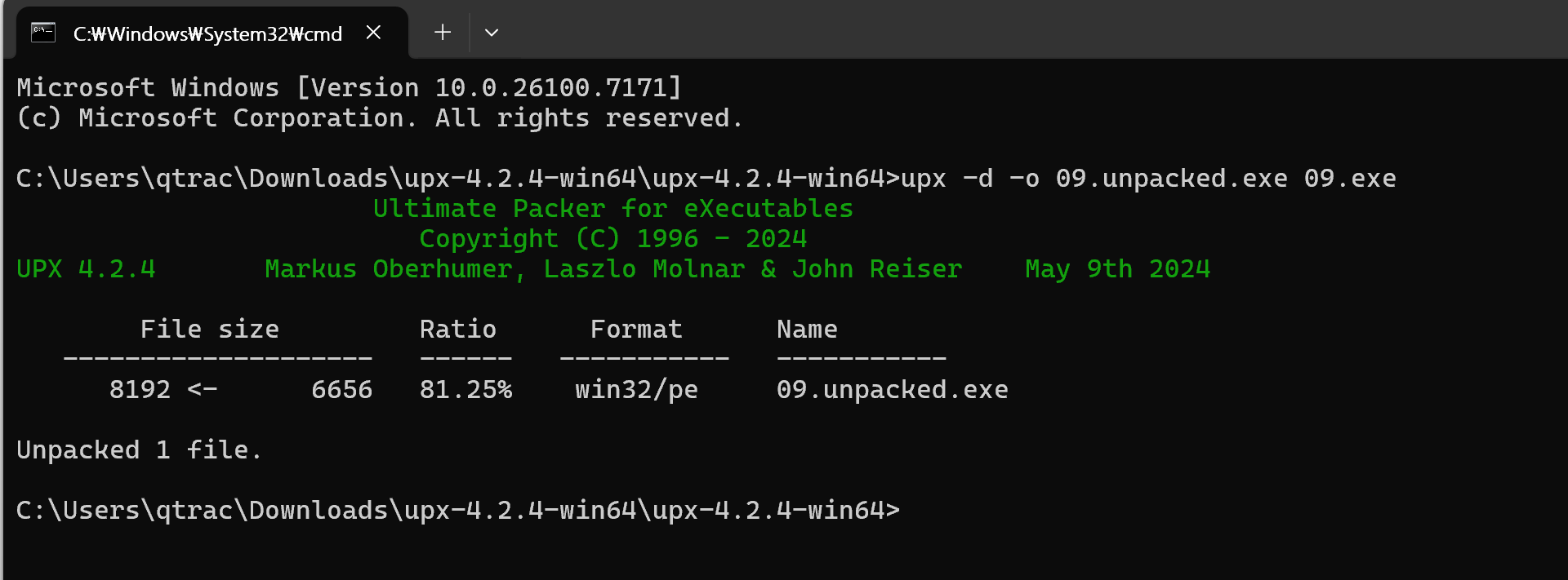 그래서 upx-4.2.4-win64 폴더 내에서, CMD를 열고 언패킹 명령어를 입력하였다.