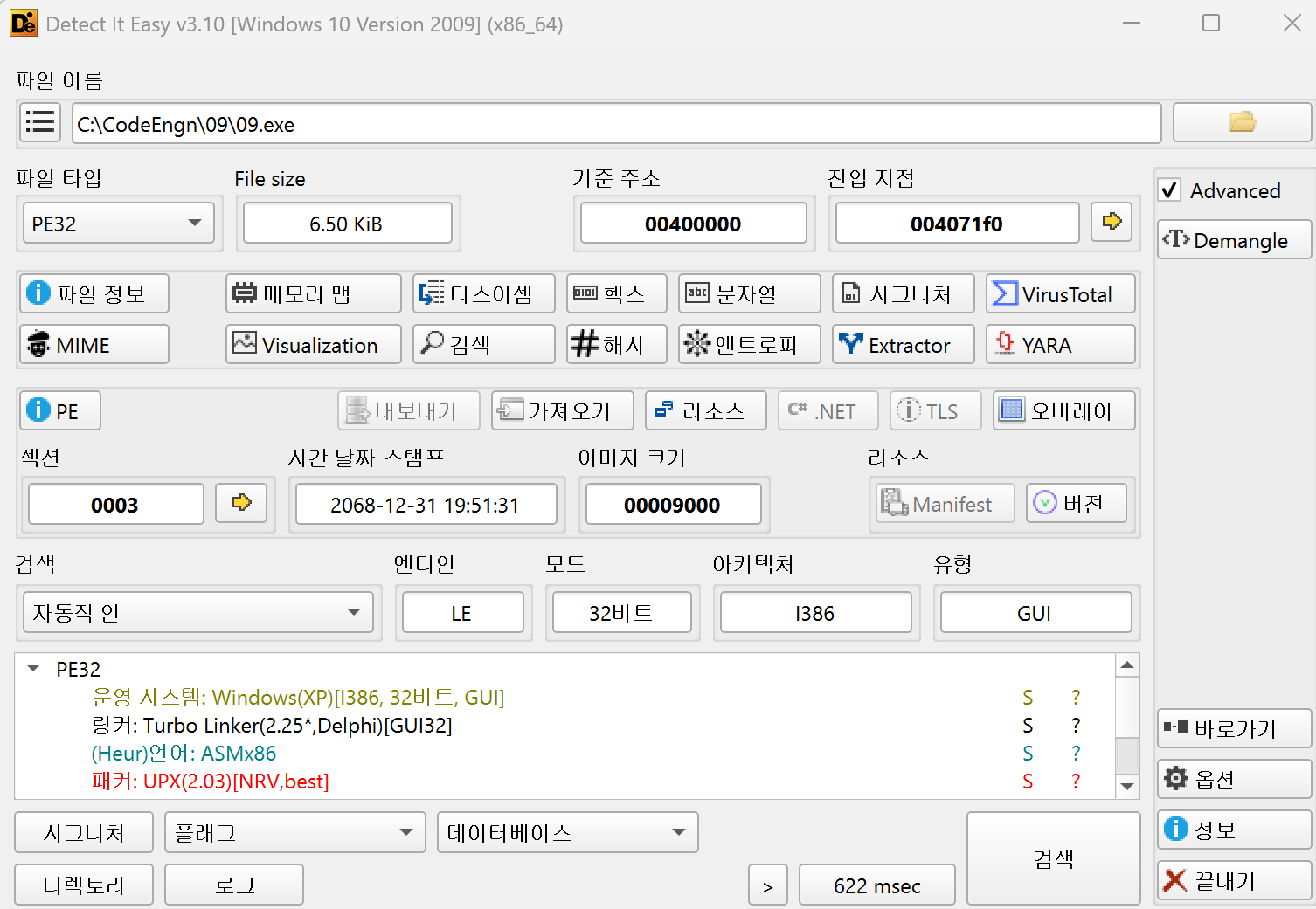 - 디버거로 UPX 언패킹 루틴 관찰하기 Immunity Debugger로 09.exe를 열어 UPX 언패킹 루틴을 확인하였다.