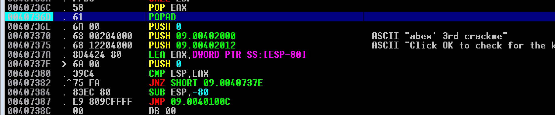 00407370 68 00204000 PUSH 09.00402000 ; ASCII "abex' 3rd crackme"