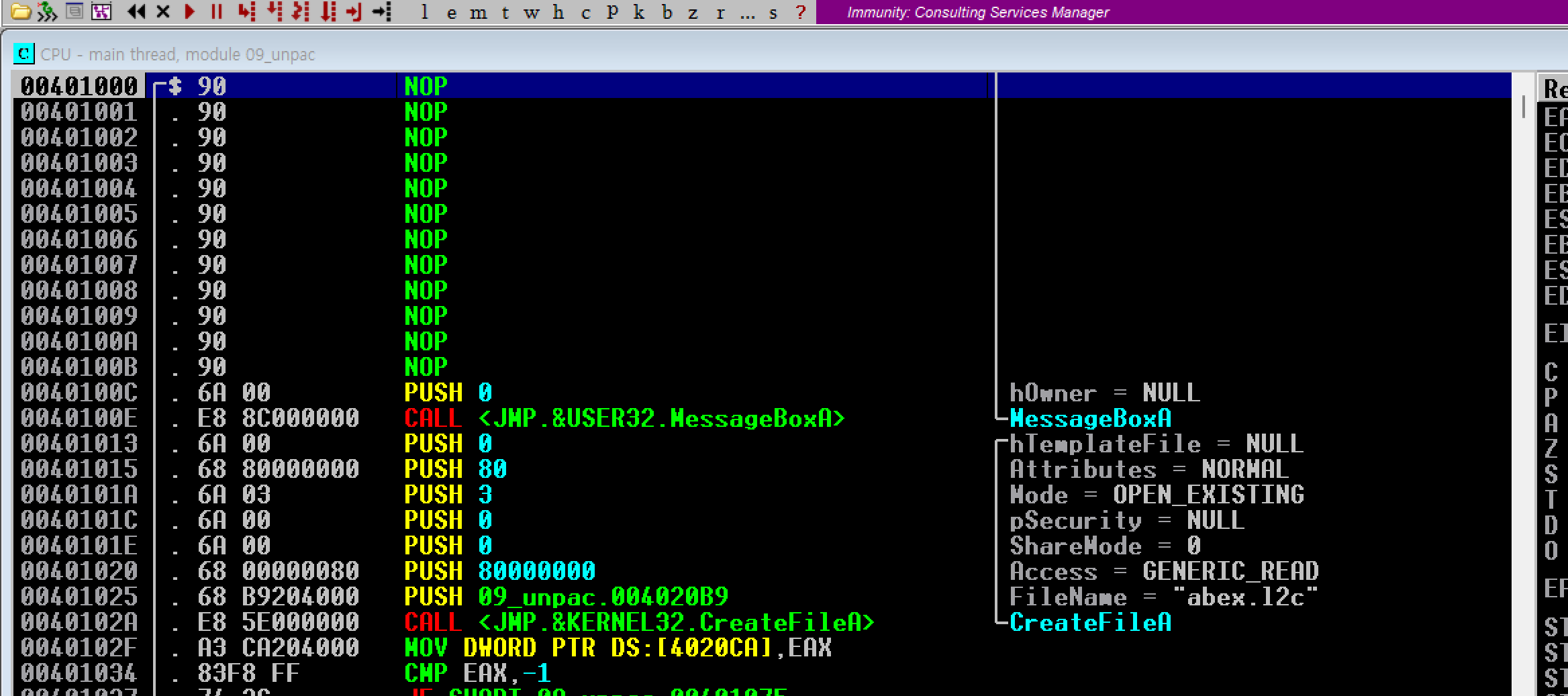 unpacked_09.exe를 디버거로 열면, 엔트리포인트(OEP) 00401000 부근의 코드가 다음처럼 보인다.